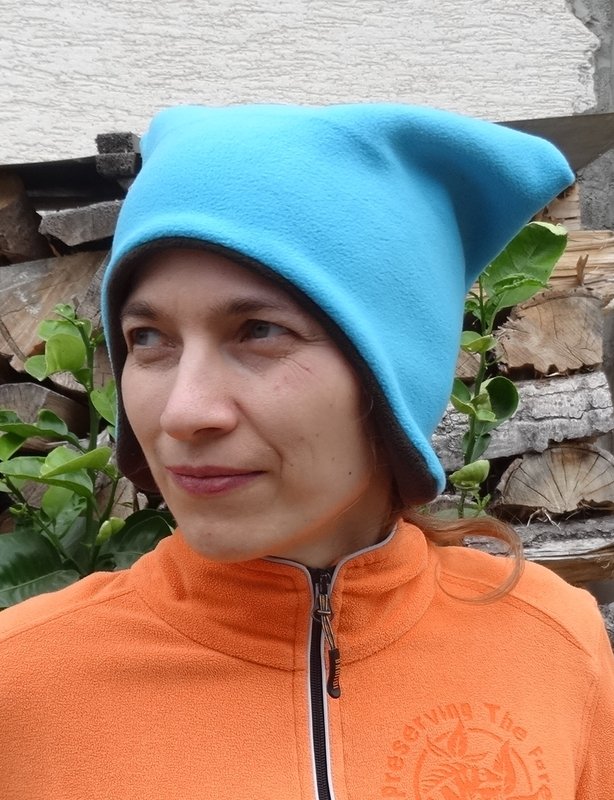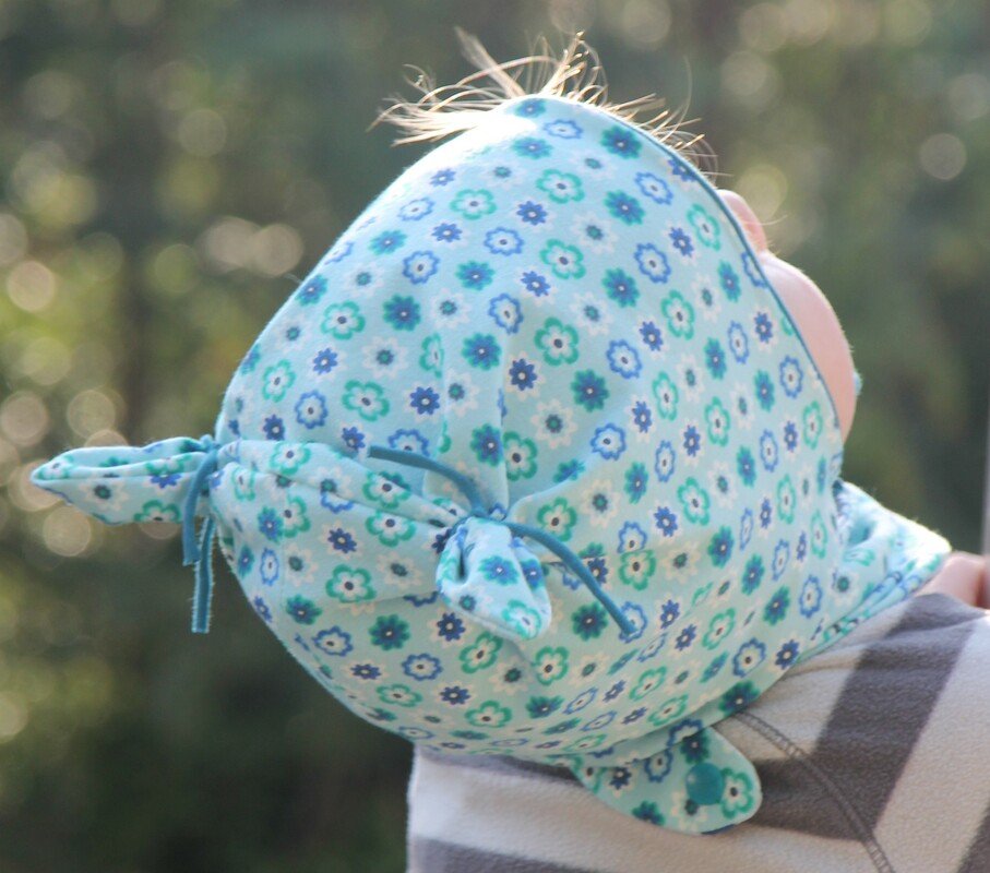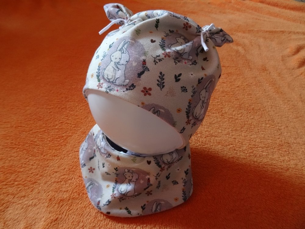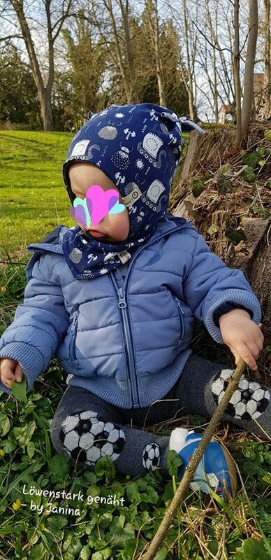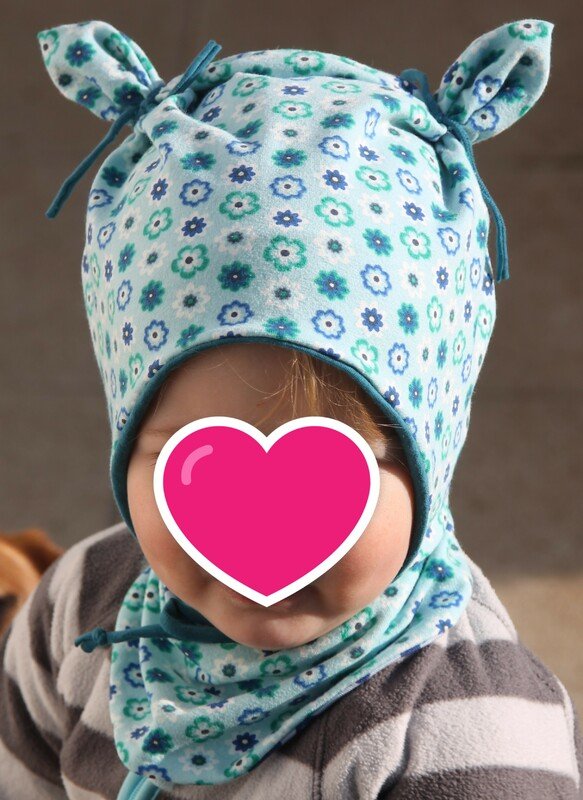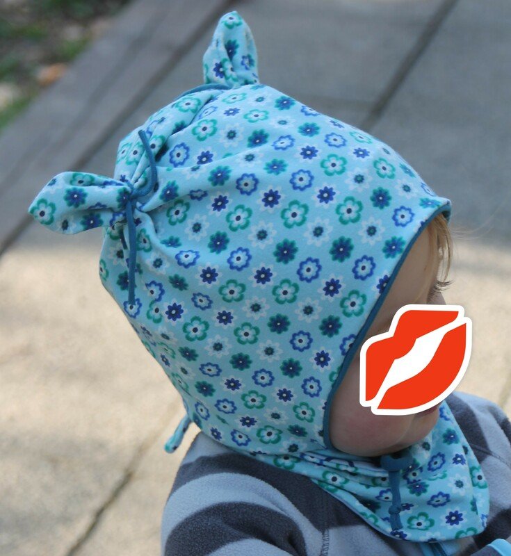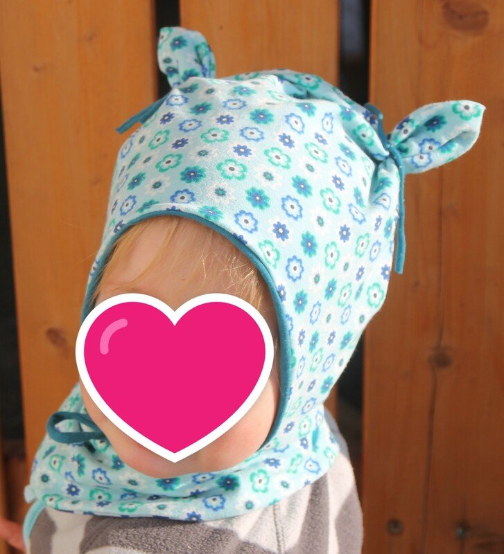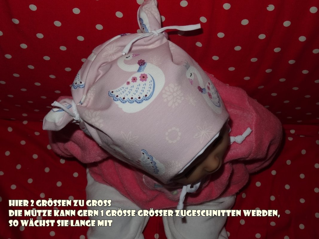 die Mütze kann gerne, wenn sie sehr lange passen soll, eine Größe größer zugeschnitten werden, durch die Bindebänder sitzt sie auch so noch gut. Die Höhe oben am Kopf wird durch die Öhrchen reguliert, da euer Schatz wächst, könnt ihr die Öhrchen später etwas nach oben schieben, so wächst die Mütze über 2-3 Größen locker mit.
