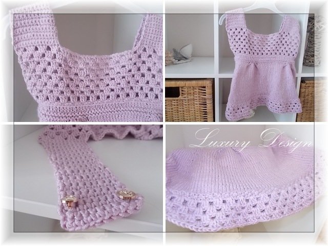 Für die kleinste Größe, 6 Monate werden 200gr. rosa Baumwolle oder Polyacrylgarn für Nadelstärke 3,5 und mit einer LL von 140m benötigt. Für die Größe 2-3 Jahre werden 300gr.benötigt.