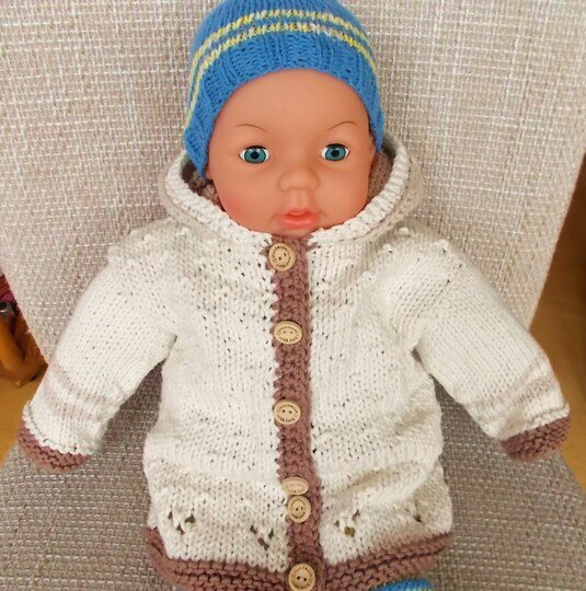Die Jacke passt von Größe 50 – 62. Bei kleinerer Nadelstärke und dünnerem Garn kann sie auch für Puppen gestrickt werden.