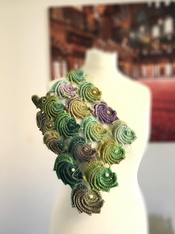 Du kannst dieses Muster als Einzelstück zB als Brosche häkeln, als Dreieckstuch, Stola oder Poncho oder oder oder