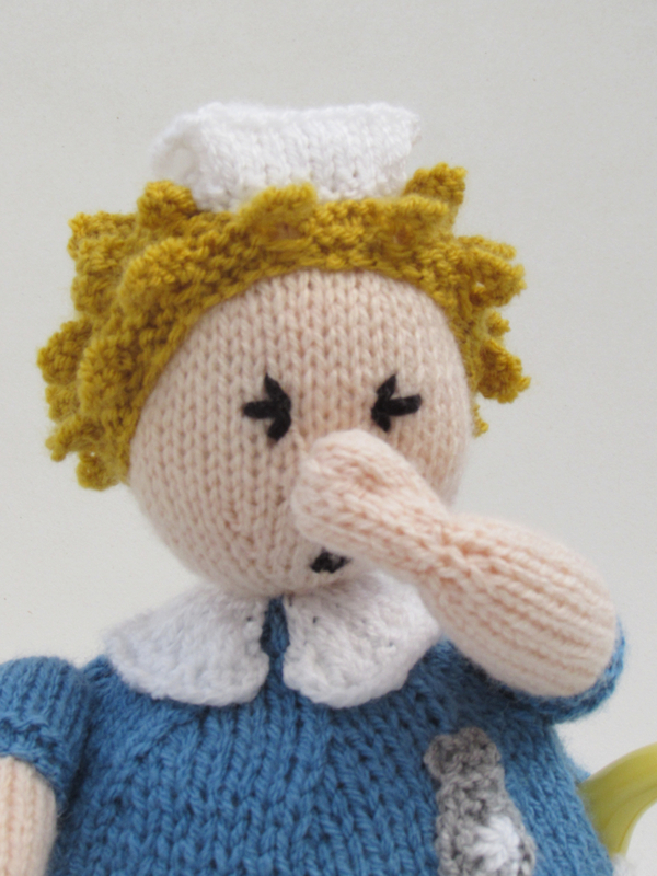 The nurse has a spiky hairstyle, that is achieved by casting on and off stitches a bit like making big buttonholes.