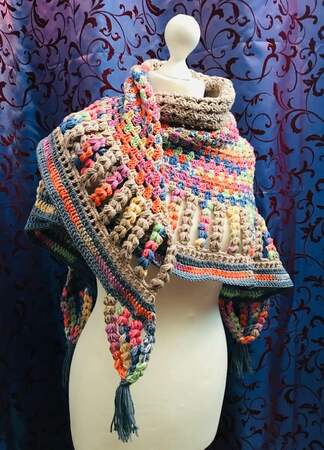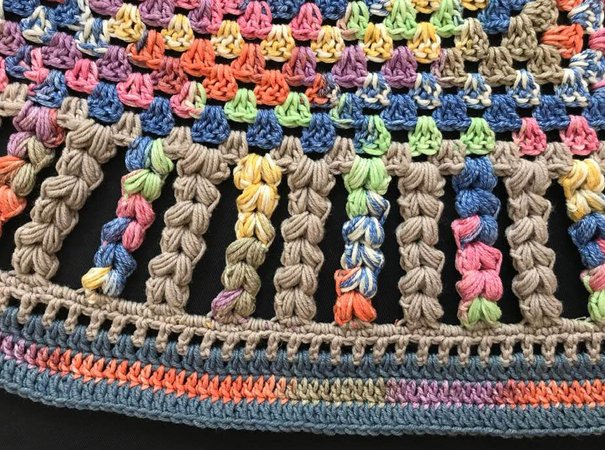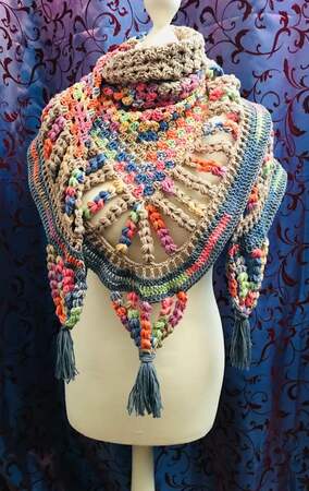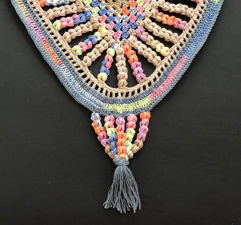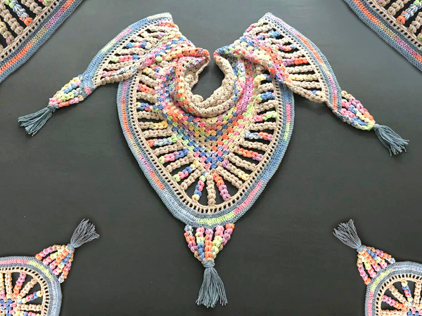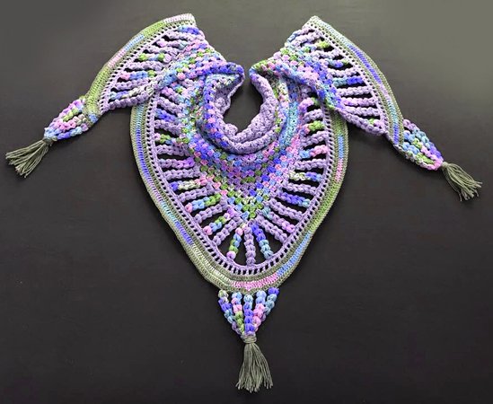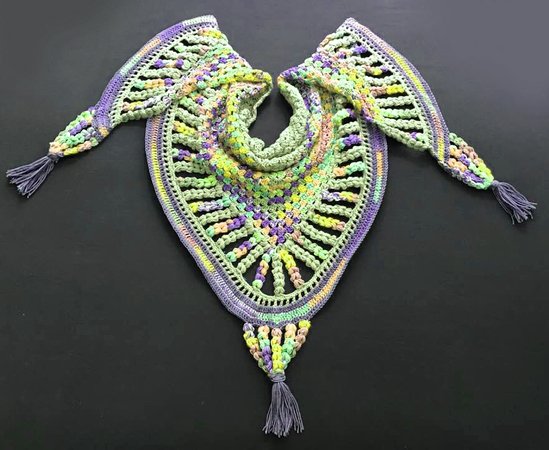 You start with a big triangle in Granny Square pattern... then you make the pretty heart chains which remind me of the sweetie chains from my childhood.