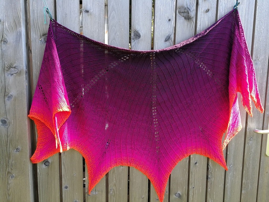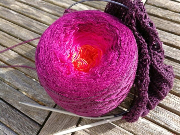 Knisterndes Lagerfeuer, gute Freunde, ein lauer Sommerabend und ein wärmendes Tuch. Was braucht man mehr? Die Wicklung von Maggie P mit dem schönen Namen „Ode an die Freude“ hat mich dazu inspiriert, Flammen symbolisch auf ein Tuch zu bannen. Durch die Merinowolle ist das halbrunde Tuch mit den dominanten Zackenspitzen schön warm und packt durch seine Größe auch den Rücken mollig ein, wenn von vorne das Lagerfeuer (englisch: Bonfire) ein Lächeln ins Gesicht zaubert. Doch nicht nur dafür ist das Tuch wie geschaffen, sondern es kann gerne das ganze Jahr als Schmuckstück zu schlichter Garderobe getragen werden und peppt somit wunderbar auf.