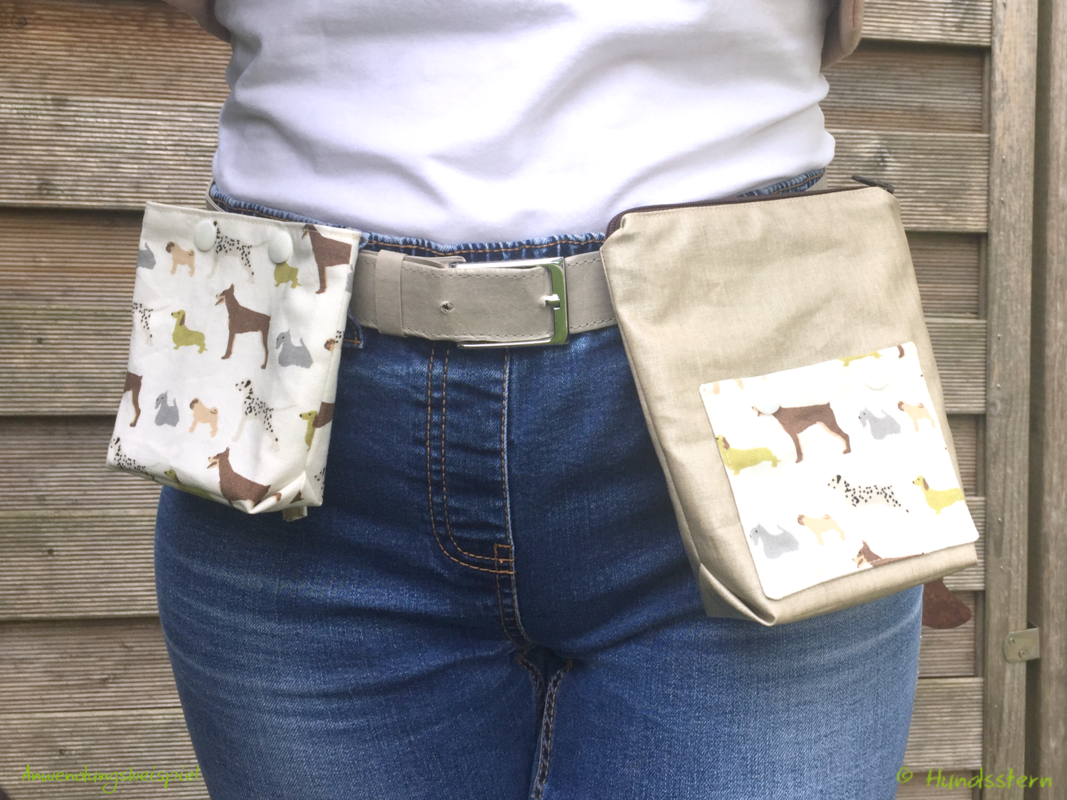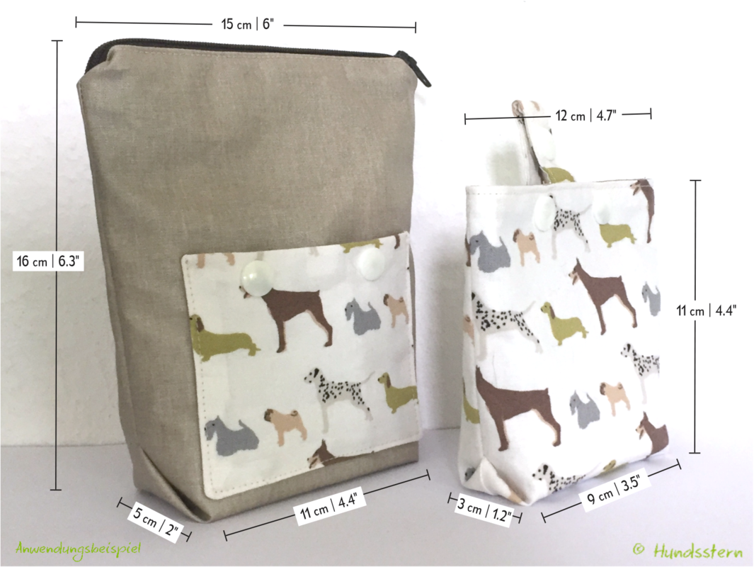 XAVER large easily fits everything necessary for walkies, the poo bag roll can be inserted into the patch pocket and the individual poo bags are pulled out between the snaps.