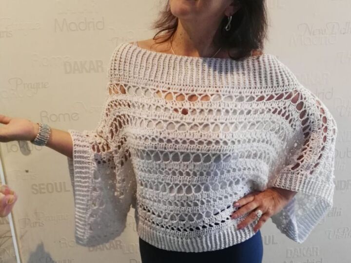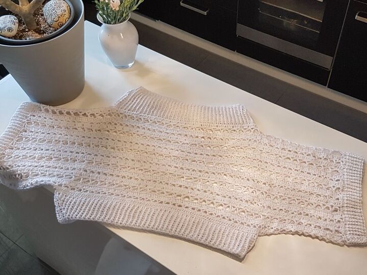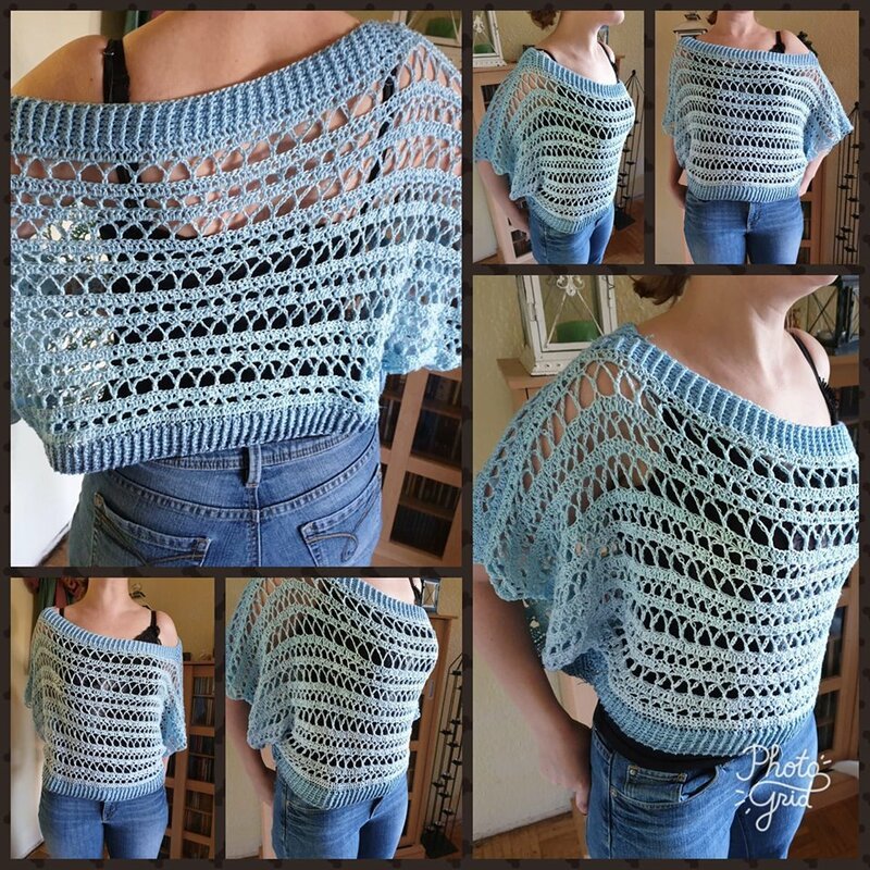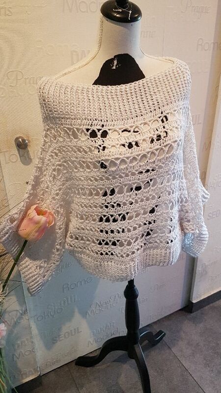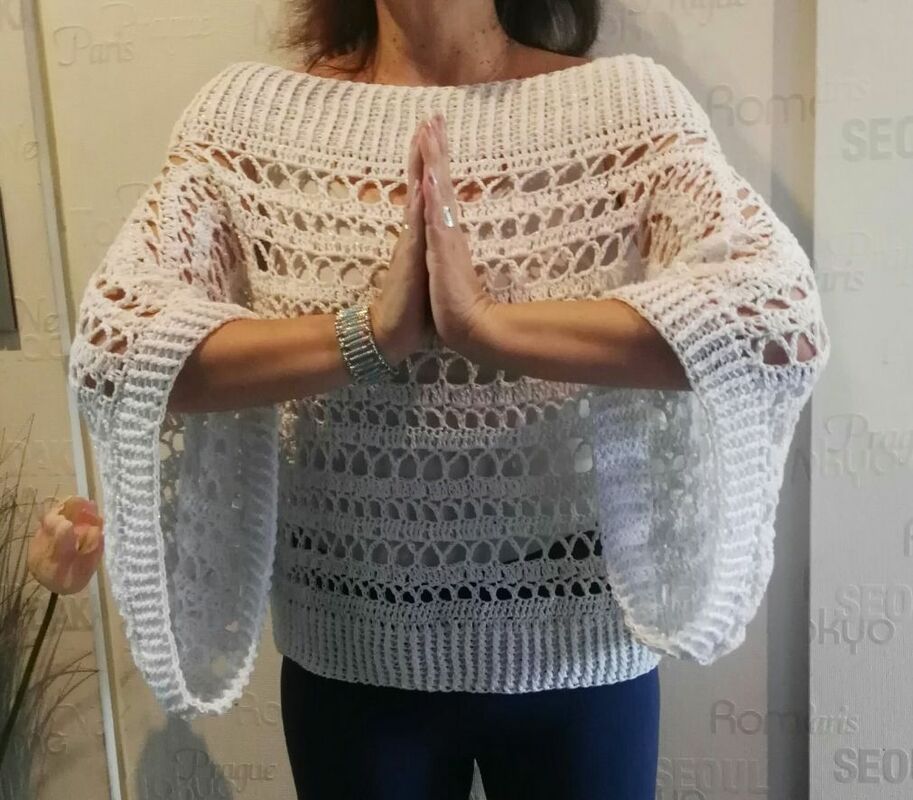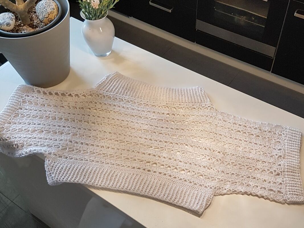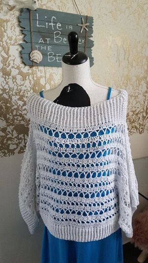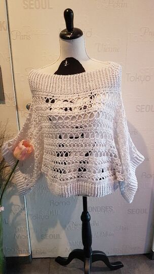 Der Pulli ist sowohl am Abend zum Ausgehen zu tragen, am Strand über den Bikini, an kühlen Nächten, aber auch untertags zur Jeans passt er super.„Nuit Blanche“ wird in 2 Teilen gehäkelt, siehe Häkelschrift, die Beiden Teile werden dann laut Skizze miteinander verbunden. Danach werden die Bündchen des Halsausschnittes, sowie der Bund und die Ärmelbündchen gehäkelt.