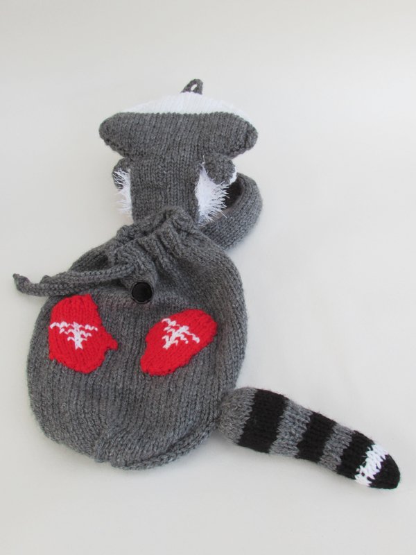 The 6 page Snack Packaway Racoon Bag Knitting Pattern knits up a wonderful Christmas theme bag of a racoon.