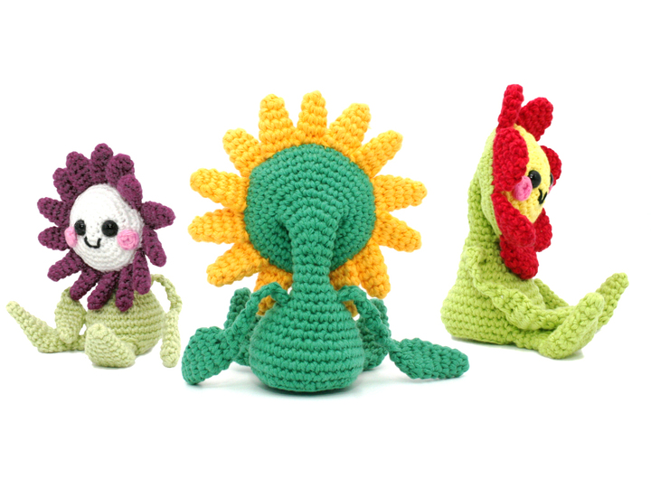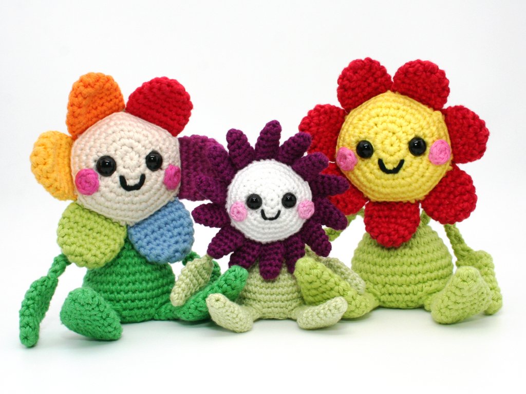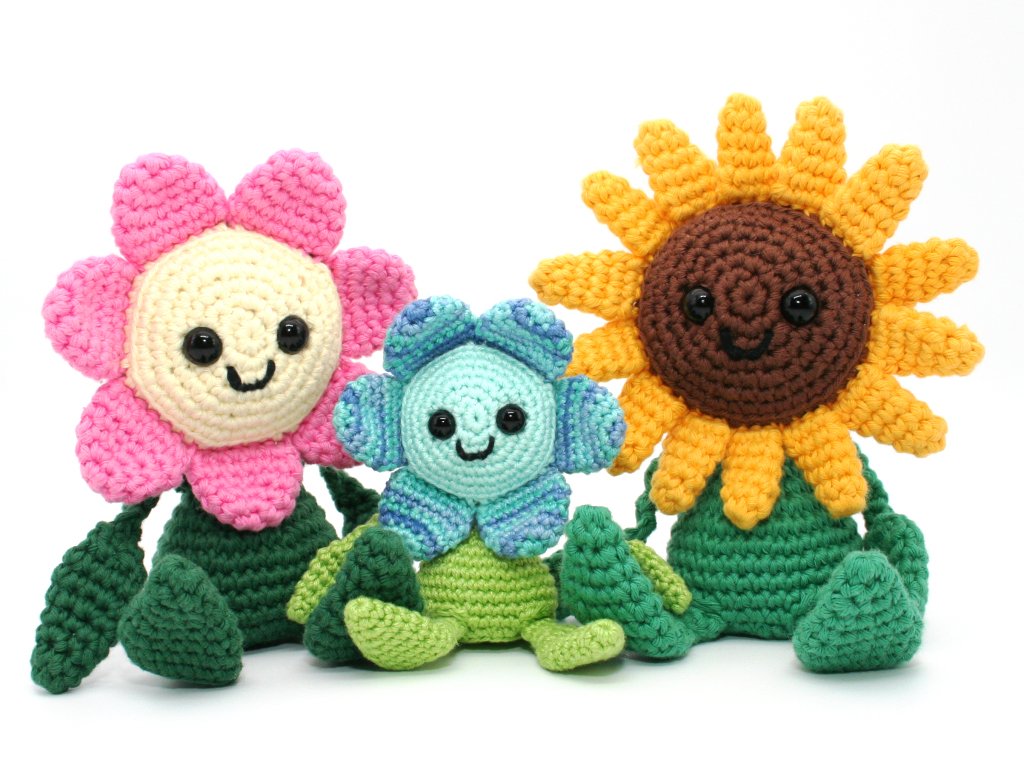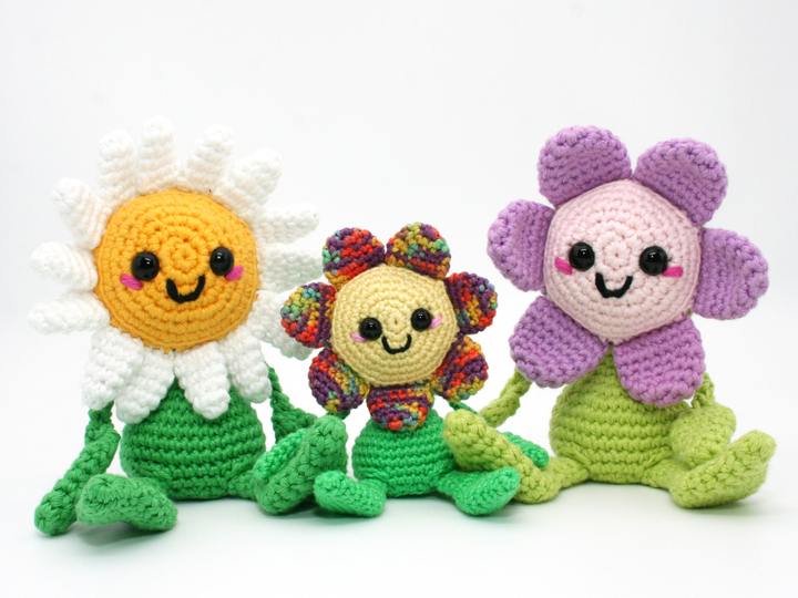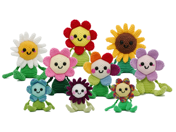 You can choose between three different styles! Make flowers with 6, 7 or 14 petals. You can even choose between three different face-styles depending on what kind of cheeks you‘d like to add, if at all. It‘s all described and included in the pattern.