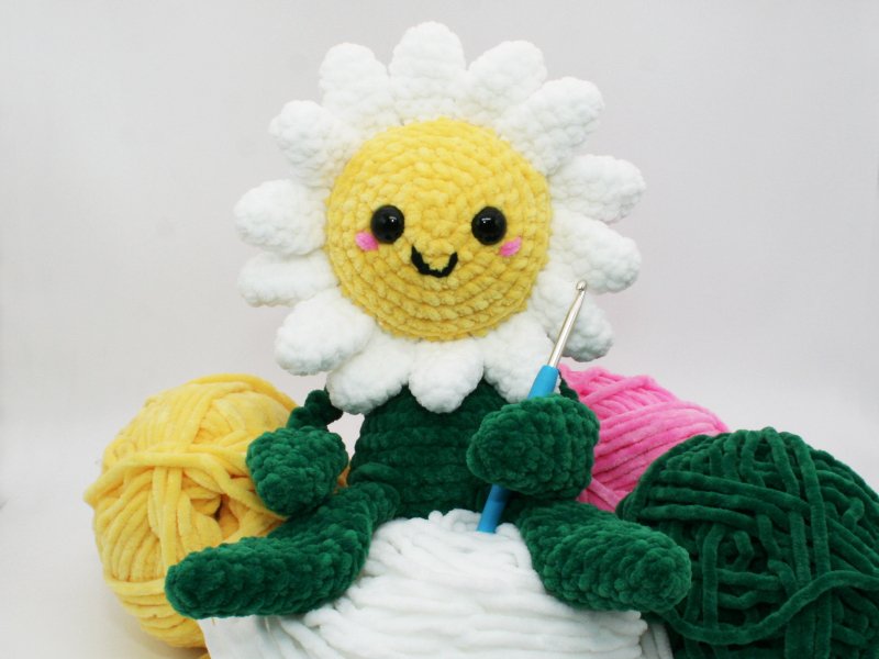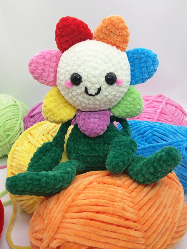 Additional to the yarn you need 1 pair of satety-eyes per flower. The size depends on the yarn weight. With Fingering/Sport yarn I used 8 mm eyes, with DK yarn I used 10 mm eyes.