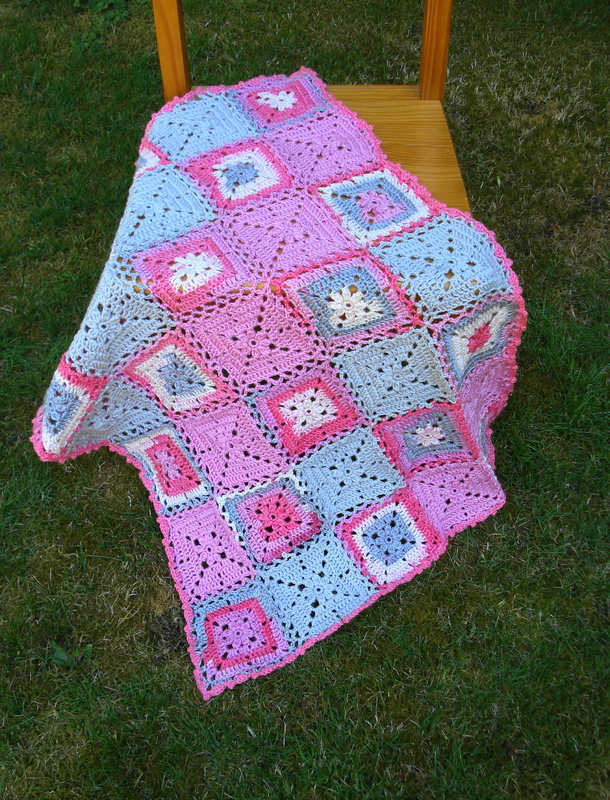 A fanciful baby blanket that will brighten up the room. Crocheted in thirty-five motifs that start in the center with a cute little flower and joined together as you work. The blanket is finished with a small border of shell stitches and picots.