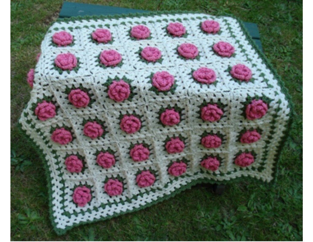 Such a lovely item for a baby girl's nursery, it is destined to become a family heirloom. This granny square baby blanket is crocheted with 36 join-as-you-crochet squares that start in the center with a fabulous rose. The blanket is finished with a matching edging and completed with a round of small shell stitches.