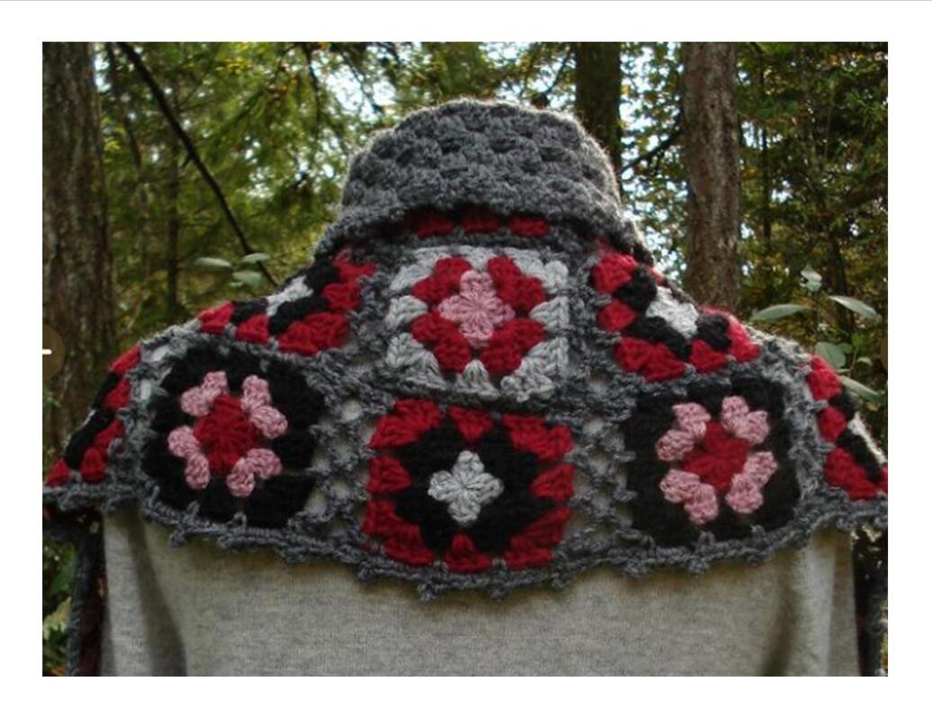 A granny square wrap with a shawl collar that ties to create a double-breasted effect.