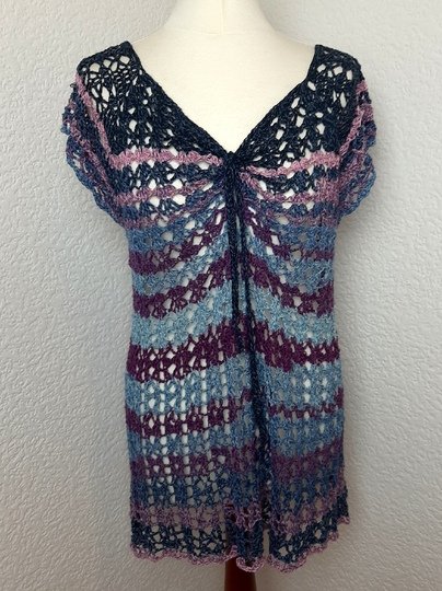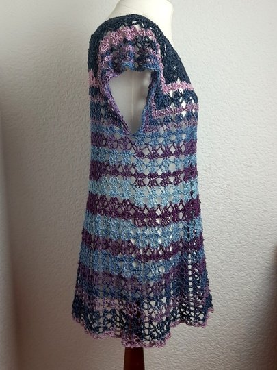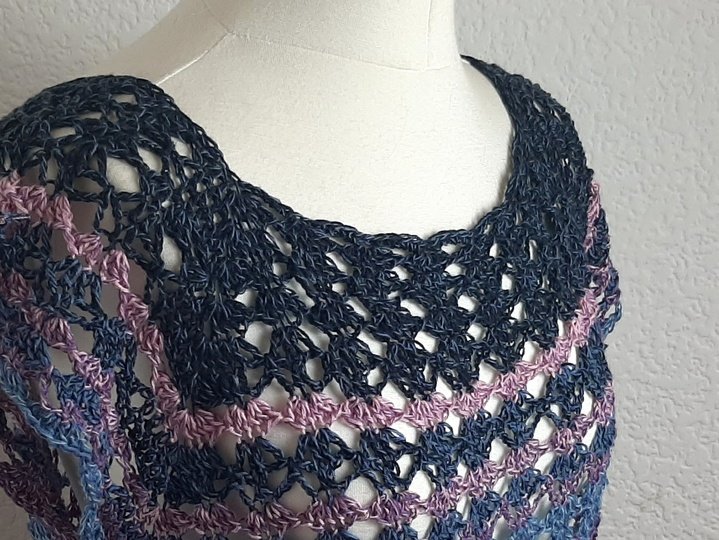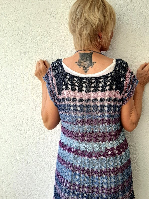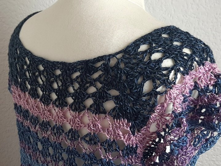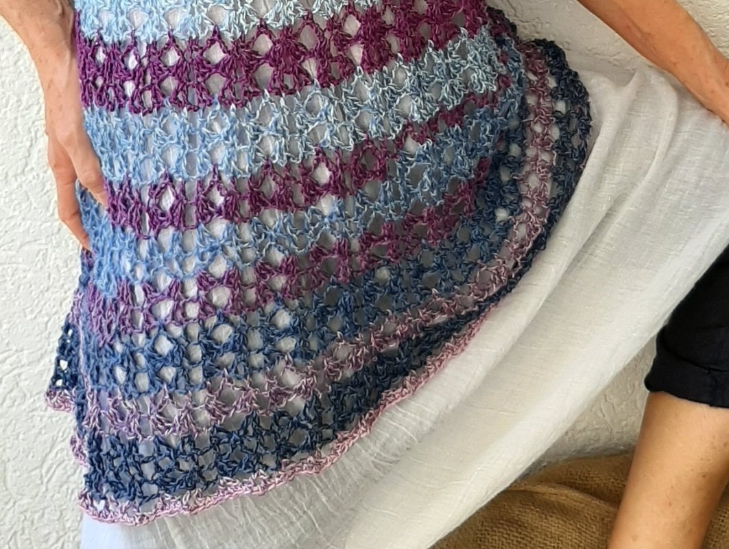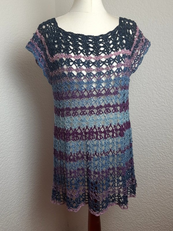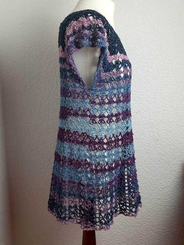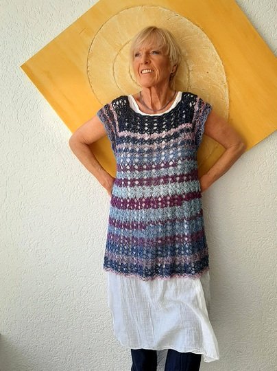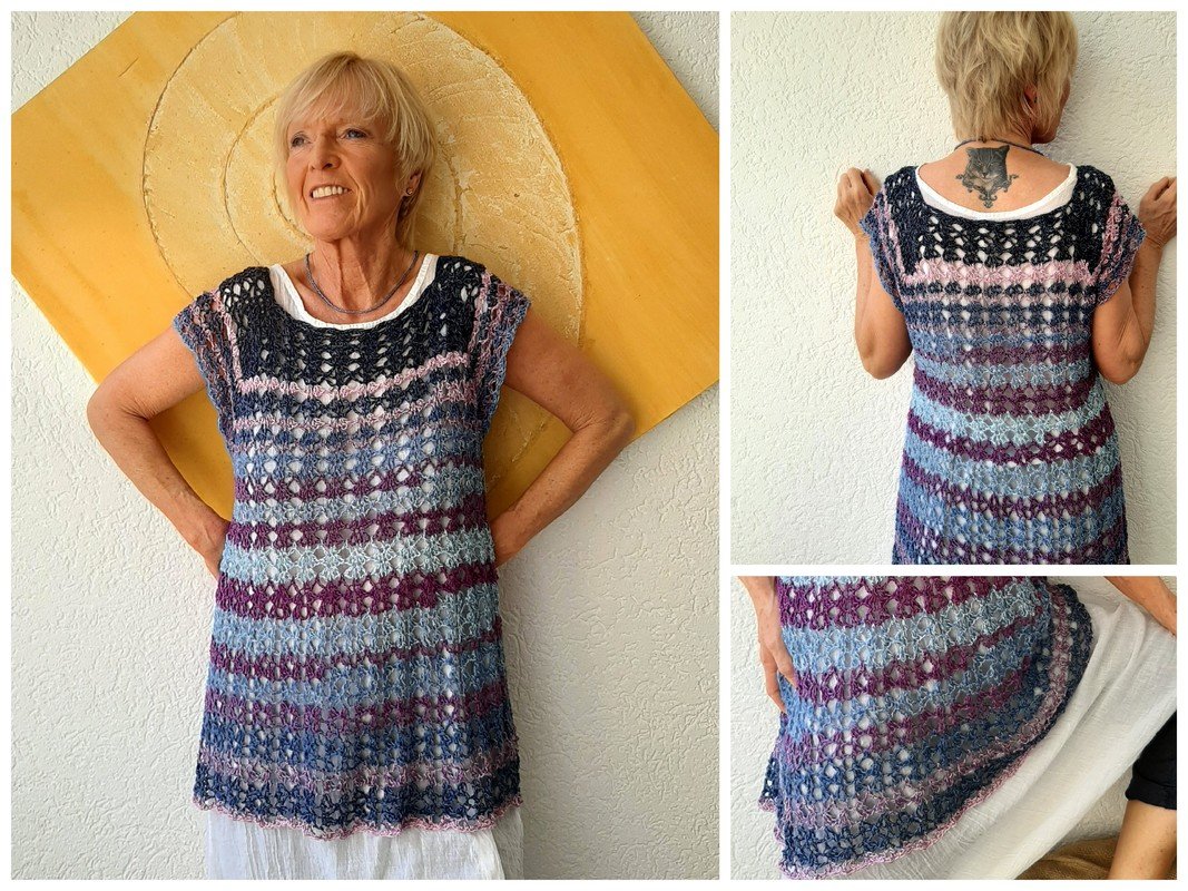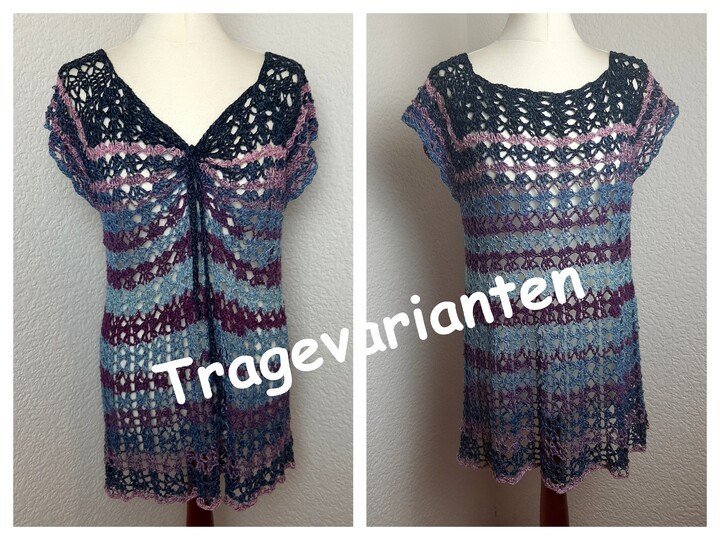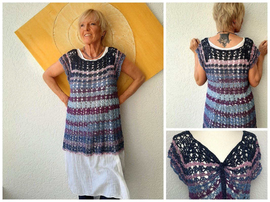 Zart und leicht wie „Liebesgeflüster“ fällt diese Tunika. Sehr schick und elegant zum Lagenlook. Sie wird in Raglan von Oben Technik, in Runden gehäkelt. Das Muster der Tunika verändert sich im Laufe der Arbeit, gewinnt an Weite und sorgt so für einen tollen Fall um den Hüften. Es gibt zwei Tragevarianten: einmal mit rundem Halsausschnitt und einmal kann der obere Teil gerafft werden!