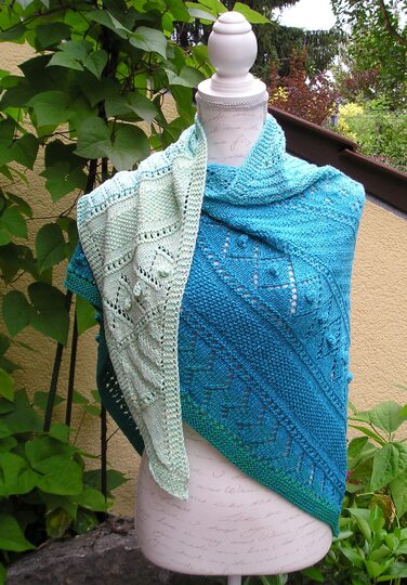 Das Tuch wird mit einem Farbverlaufsgarn von der Garnmanufaktur gestrickt.Die verwendeten Farben für die Sonderwicklung sind in der Anleitung aufgeführt. Man beginnt mit einem Zipfel und nimmt an einer Seite Maschen zu, damit das Tuch in die Breite wachsen kann. Man strickt einzelne Streifen mit Lochmustern oder einfachen Mustern mit rechten und linken Maschen. Das ist ein Tuch für fortgeschrittene Strickerinnen. Obwohl... für die verschiedenen Muster gibt es Strickschriften. Ein kraus rechts gestrickte Rand wird gleich mit gearbeitet, so dass das Tuch zum Schluss nicht mehr umhäkelt werden muss. Entstanden ist ein Tuch in kühlen Farben mit abwechslungsreichen Mustern.