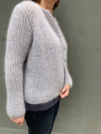 Die Jacke wird komplett in Halbpatent von unten nach oben gestrickt. Sie hat ausgestellte Ärmel und kann geschlossen werden. Wer keine Knöpfe mag, kann die Knopflöcher einfach weglassen.