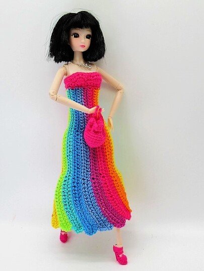 Dieses wunderschöne Kleid schillert in allen Regenbogenfarben und wird alle kleinen Mädchen begeistern. Du kannst es in jeder beliebigen Länge häkeln. Dazu gibt es noch die Anleitung für ein passendes Handtäschchen.