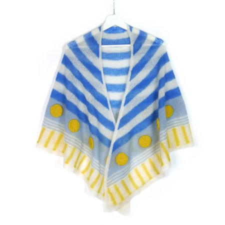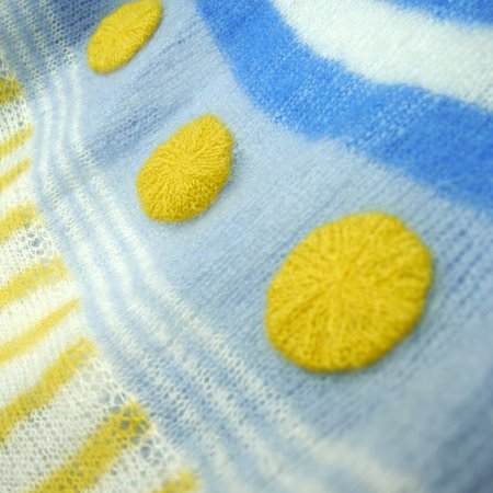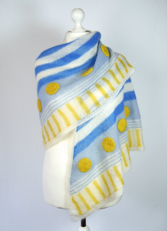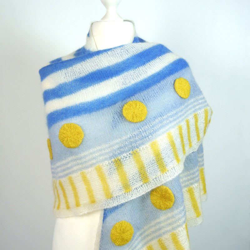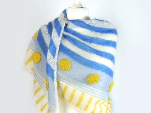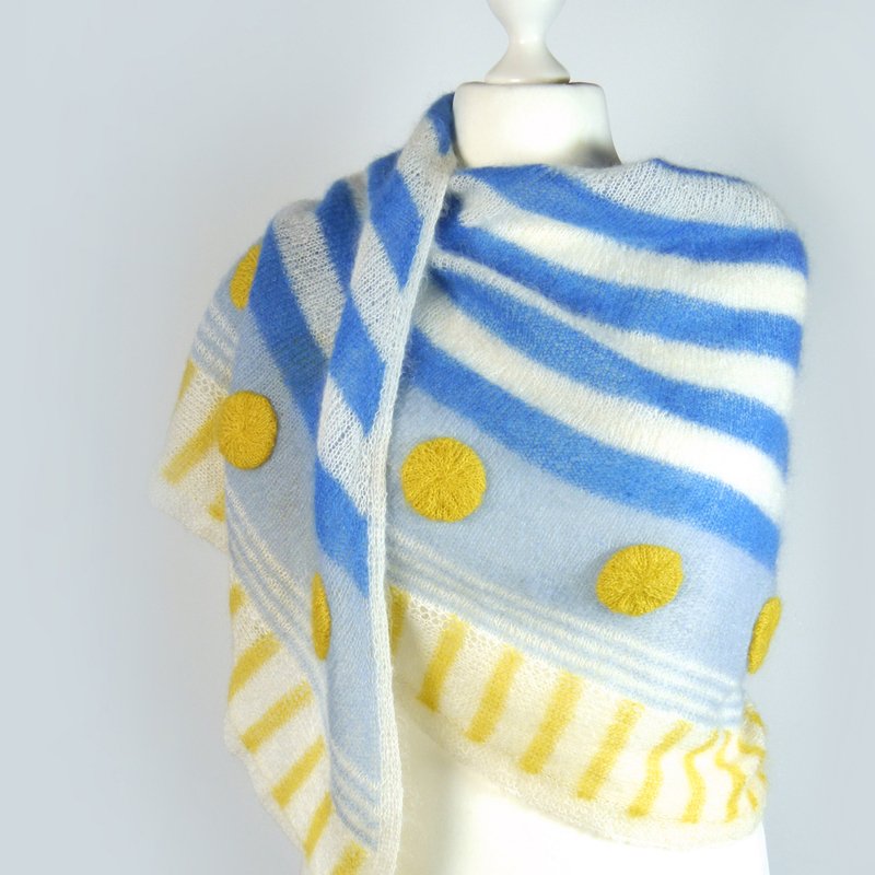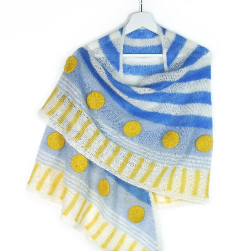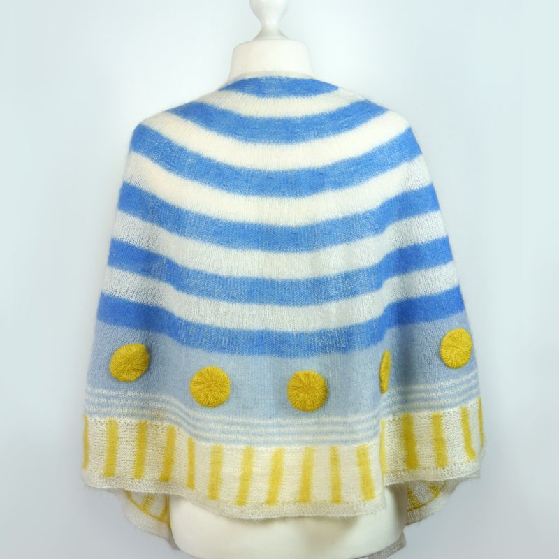 colorway with separately knitted dots that remind of portholes. Of course you can choose other color combination, there are loads of suggestions in the pattern and the picture gallery. Please choose lightweight and thin yarns with a halo, like mohair, that hide the irregular placed increases.