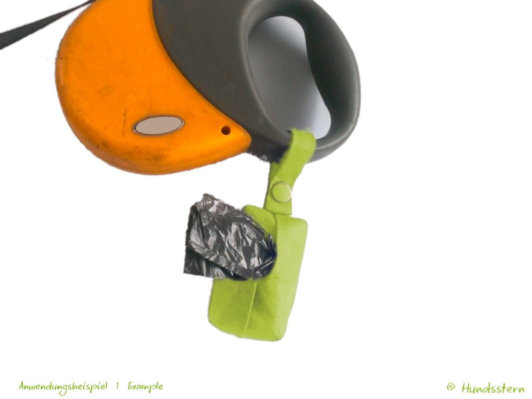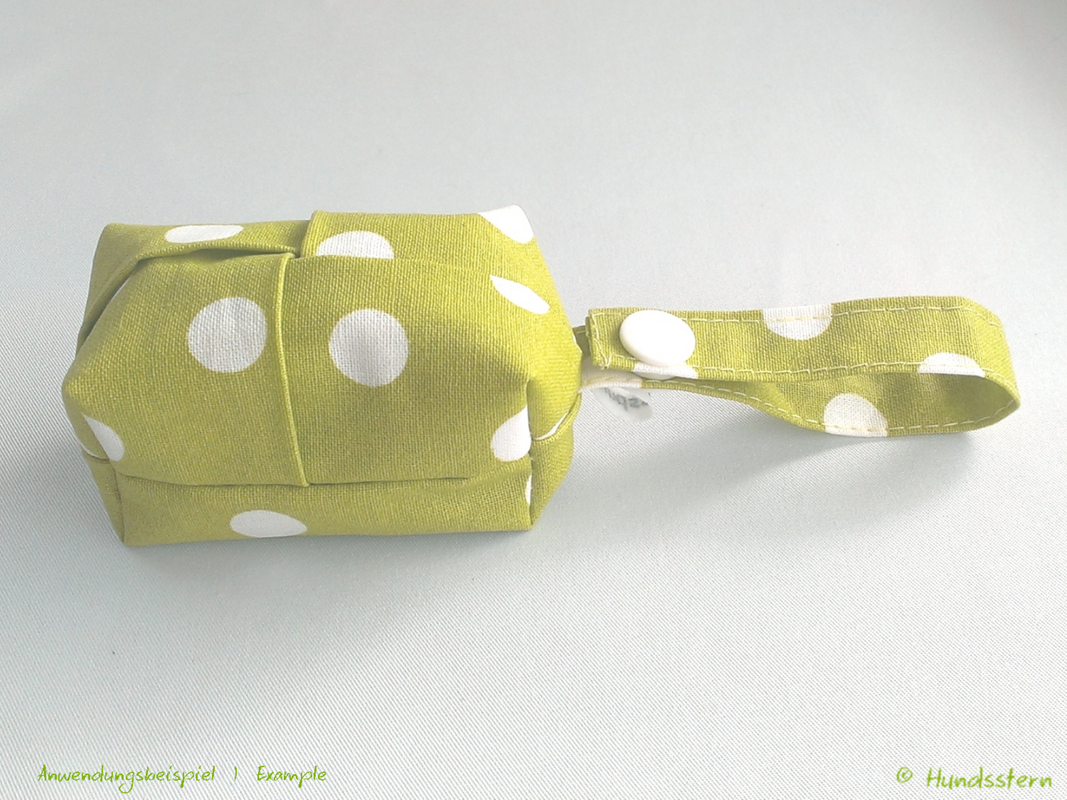 Sewing pattern and instructions for a stylisch poo bag pouch with a cardboard box style closure, with strap to fasten it to the leash, jacket or belt.