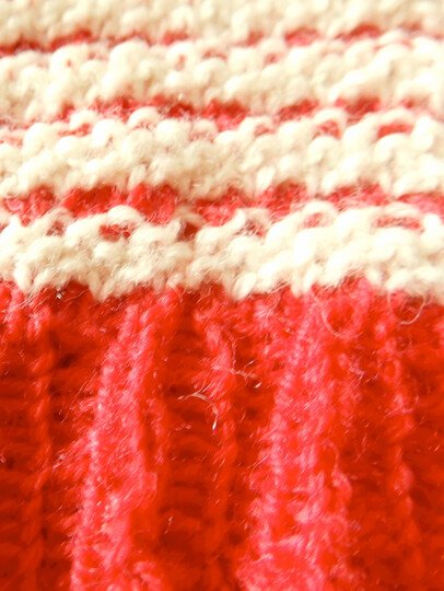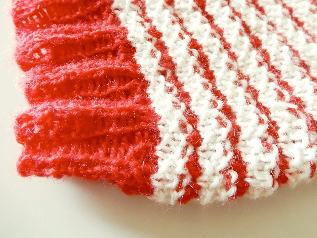 Yarn: Lang Yarns Jawoll Superwash 75/25 (75% wool, 25% nylon; 209m/50g; 229yds/1.76oz), 1 skein of each color. Sample in adult size used 88m (96yds) of color 1 (red) and 113m (123yds) of color 2 (white).