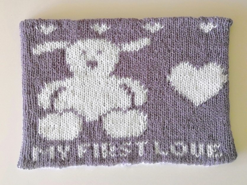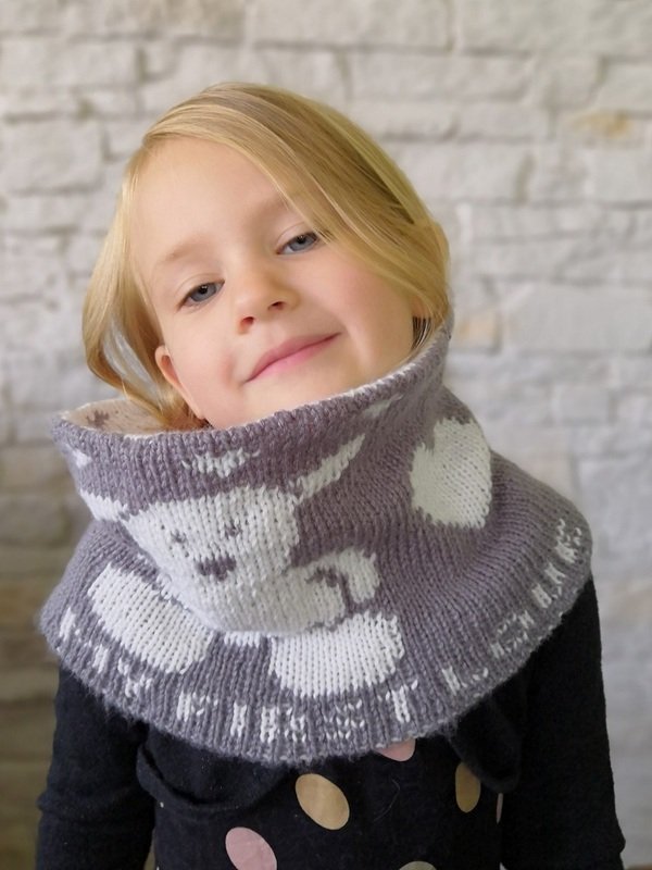Inspired by my little daughter’s favourite cuddly toy, a meanwhile quiet worn sheep, I designed this cowl in double knitting. Because of the cute motive (namely her best friend!) and the cuddly material, my daughter immediately fell in love with the new cowl. I hope you and your child will be just as fond of it!
