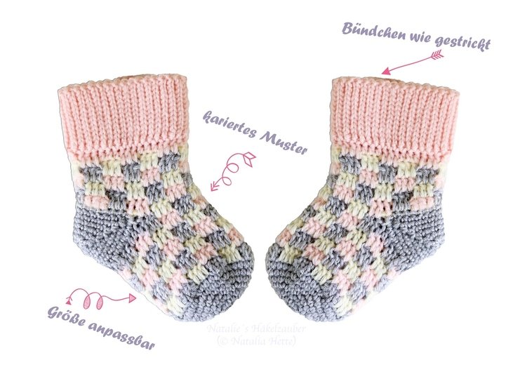 Crocheting soft baby & children's socks quickly and easily for your child or grandchild is no problem at all with this pattern! An unusual plaid pattern, easily adjustable size and the knitted-look cuff make these socks a real eye-catcher!