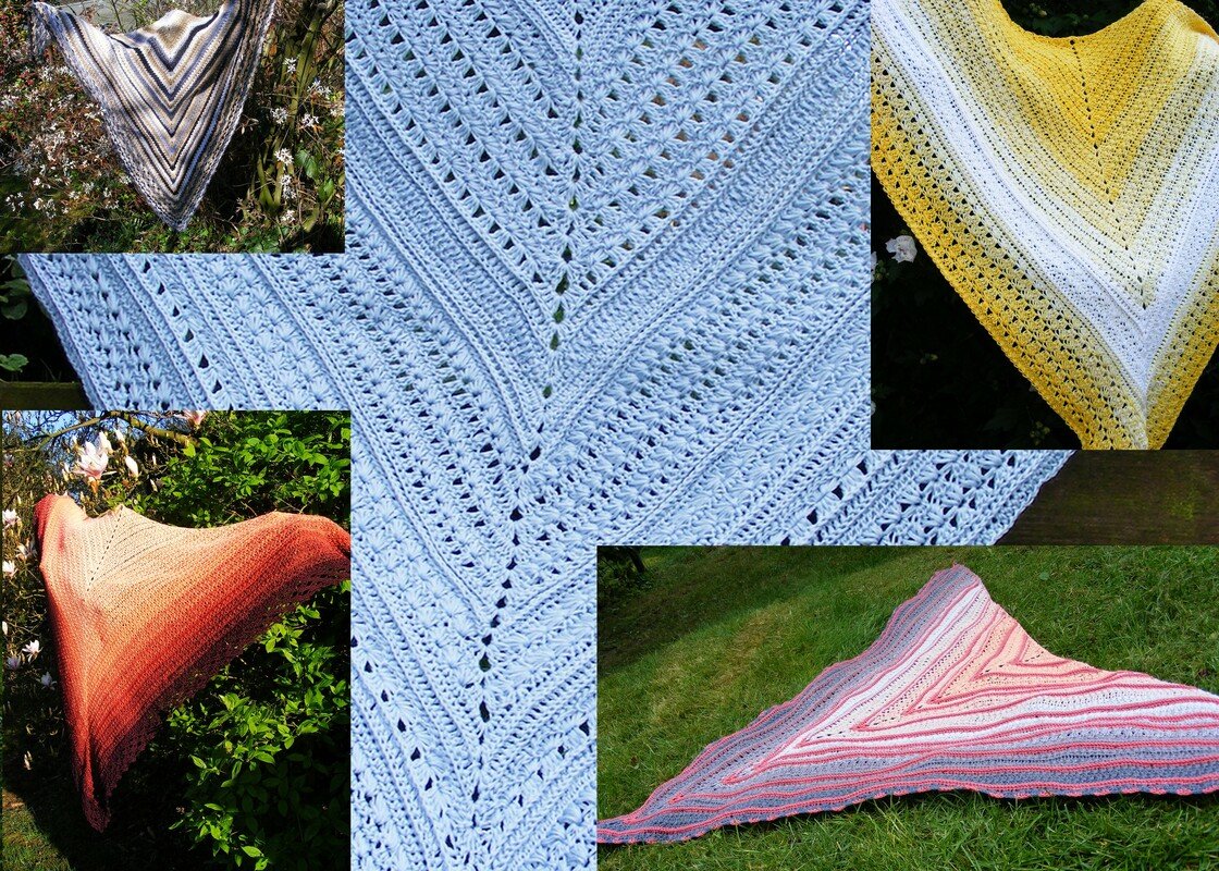 Die Tücher können ganz individuell gearbeitet werden. Die Größe variiert dabei vom verwendeten Garn und der Größe der Häkelnadel. Bei den fertigen Tüchern habe ich immer dazu geschrieben, welches Garn und welche Nadel genutzt wurde.