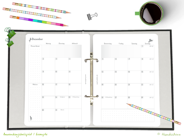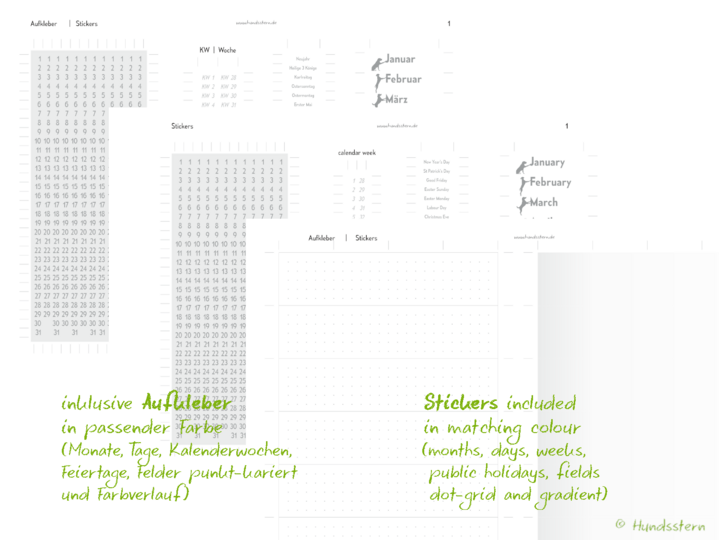 including stickers in matching colors (months, days, calendar weeks, public holidays, fields dot-grid and