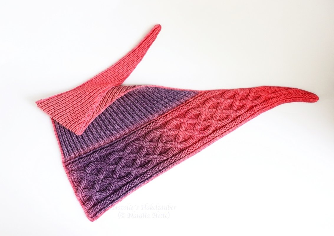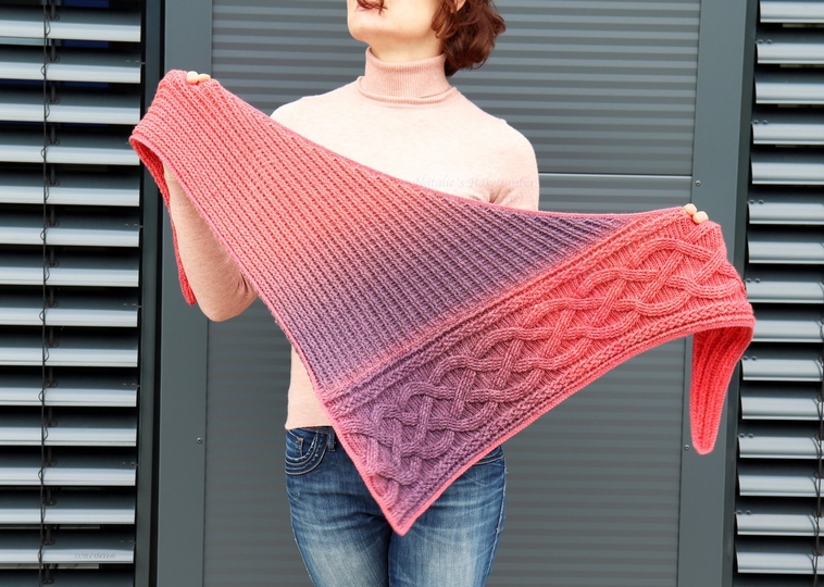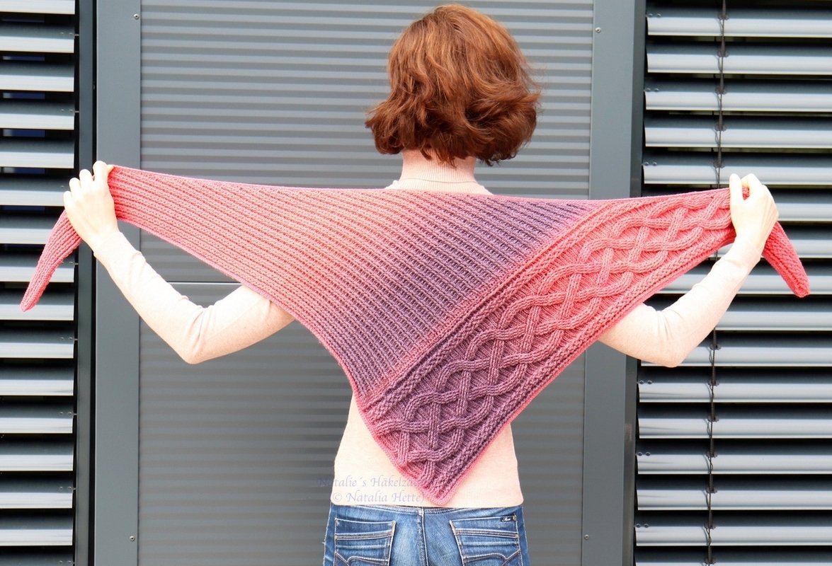 The pattern is intended for advanced knitters, but beginners with previous knowledge (fpdc, bpdc, sl st) can also try this shawl.