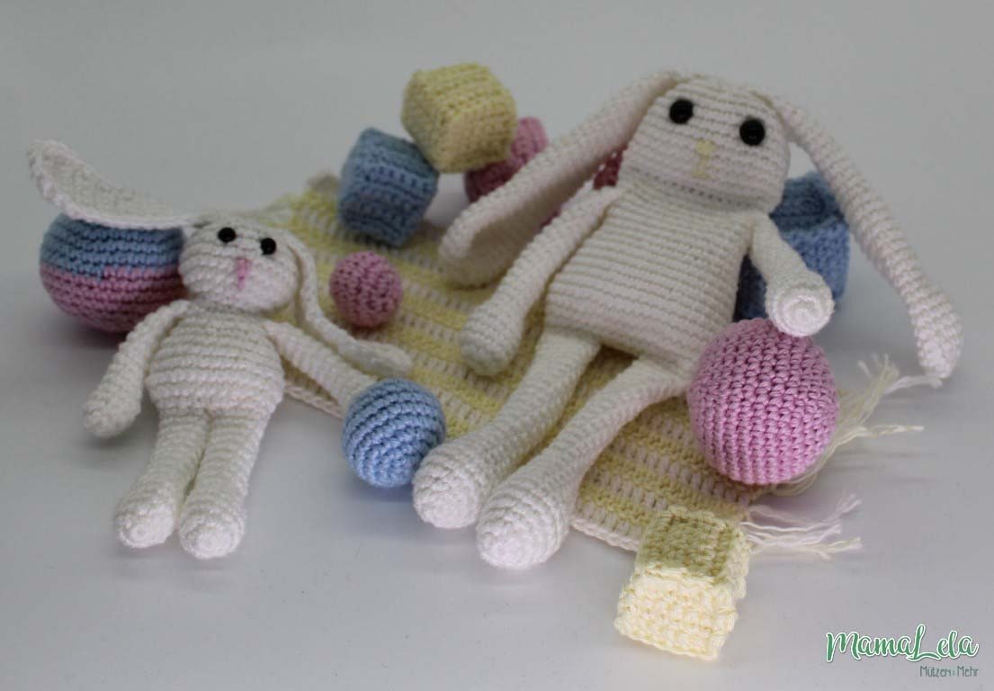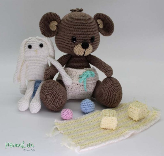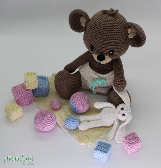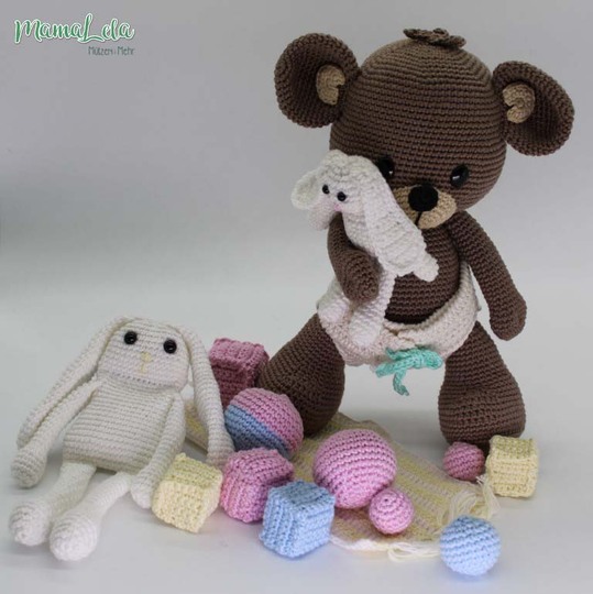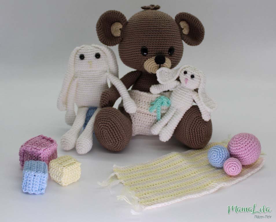Mit dieser Häkelanleitung könnt ihr euch den im Artikelbild gezeigten Teddy, sein kleines Häschen und den passenden Spielgefährten samt Spielzeug häkeln.