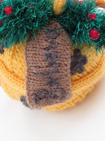 The bell has a red Christmas ribbon on one side, red and gold are a traditional Christmas colour combination and give the cosy a festive glow. On the top is a sprig of Christmas tree and red berries. The Spruce is made using King Cole Tinsel, and it really give the cosy a touch of Christmas magic.