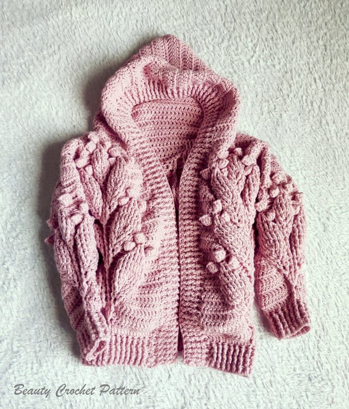 Hooded Leaves Cardigan is open cardigan pattern for sizes: 4-6 years; 7-8 years; 9-10 years