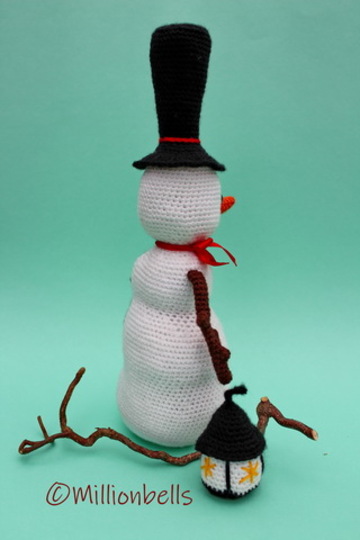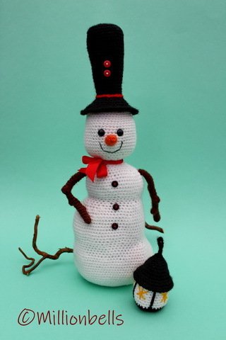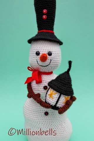 This PDF pattern describes in US terminology how to crochet a snowman as shown on picture, including the lantern.