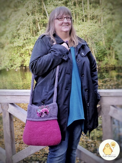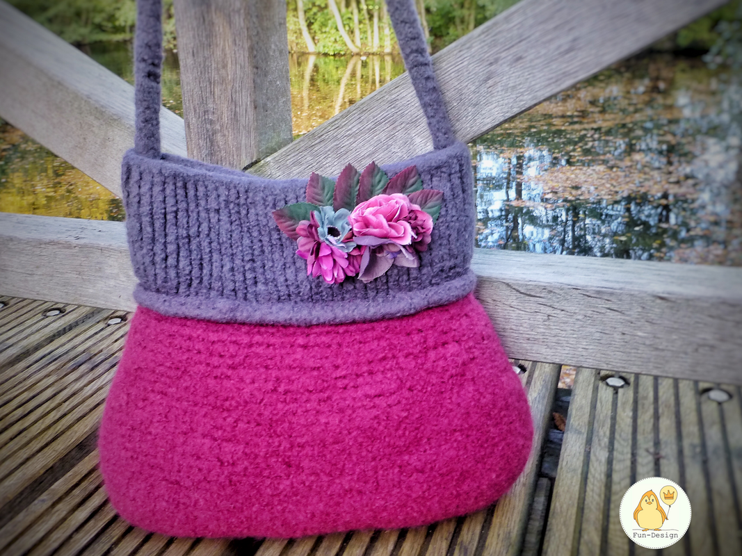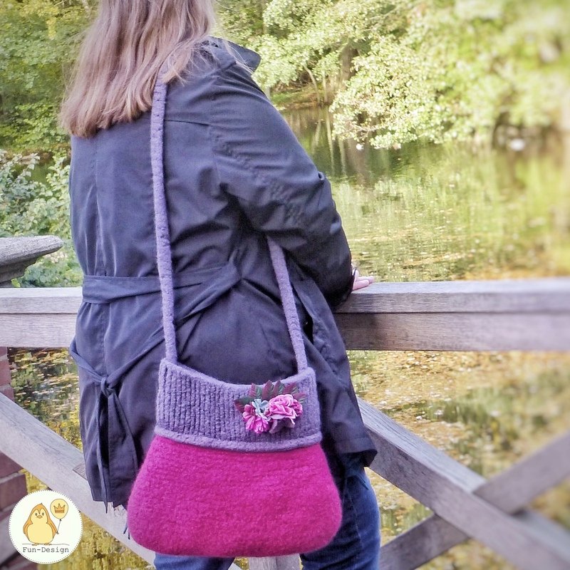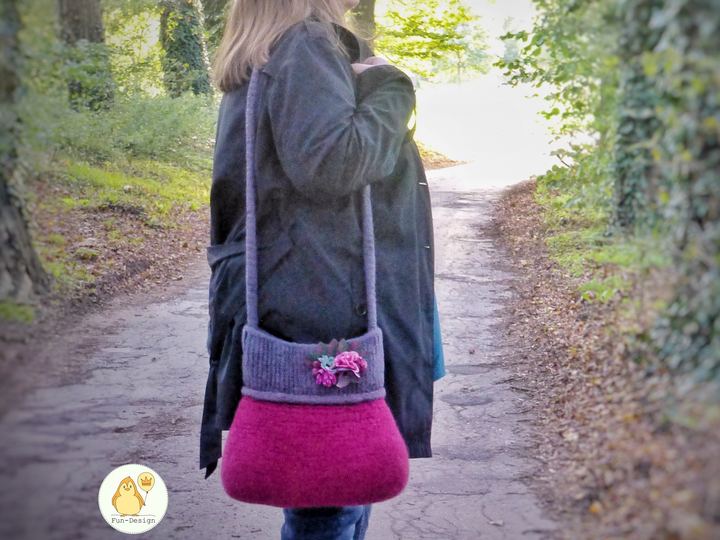 Nach dem filzen in der Waschmaschine ist die Tasche ca. 35cm breit und 31cm hoch, der Gurt ist ca. 115cm lang.