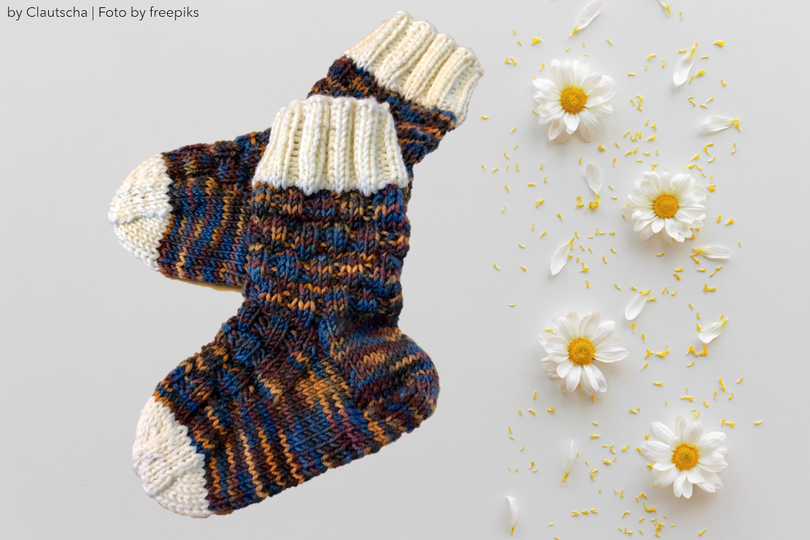 Ich habe für die Söckchen Wolle von LanaGrossa CoolWool Merino in bunt und weiß (Lauflänge 160 m / 50 g) benutzt. Es kann aber auch jede andere beliebeige Wolle in ähnlicher Stärke verwendet werden.