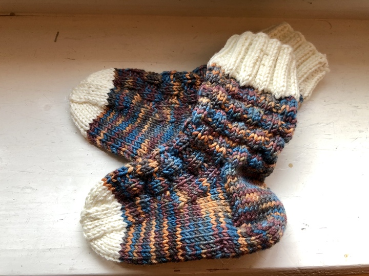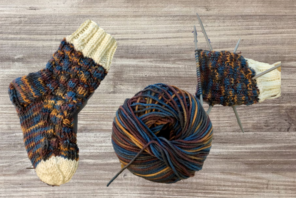 Pro Socke benötigt man ca. 16g Wolle und ein Nadelspiel Größe 3.