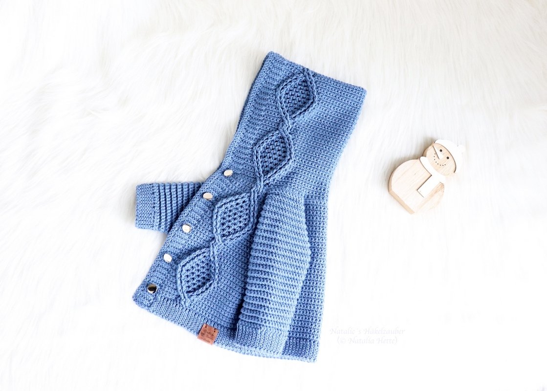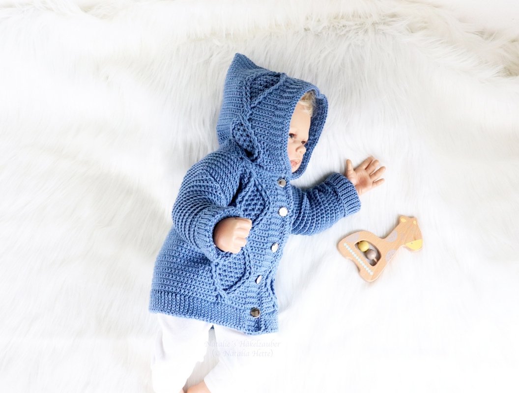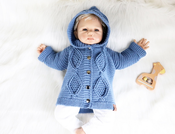 This PDF crochet tutorial consists of illustrated tutorial for crocheting a baby or children's jacket for size 0 m. to approx. 5 year old child with hood and cable & diamond pattern. This jacket is crocheted as one piece (raglan jacket) and has no seams. A great garment for comfortable wear!