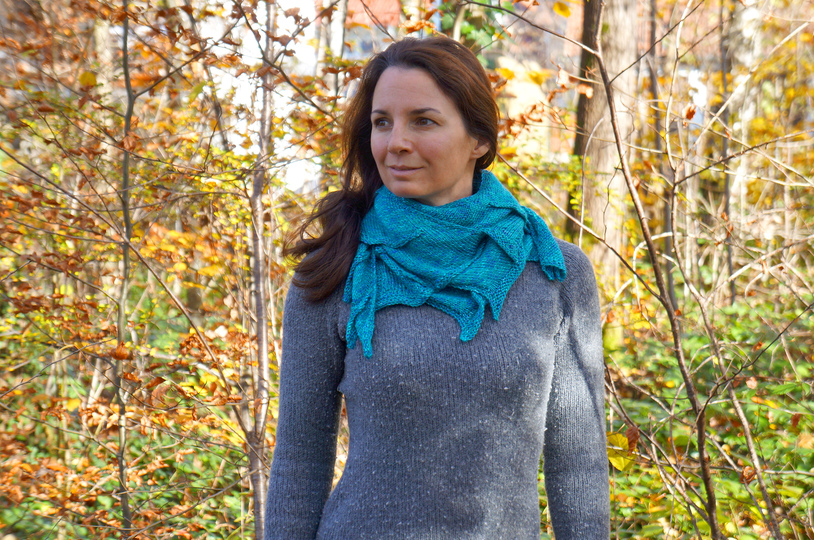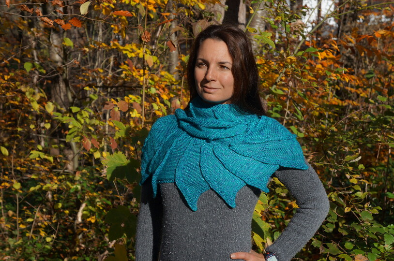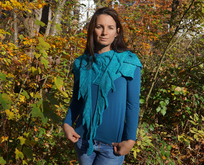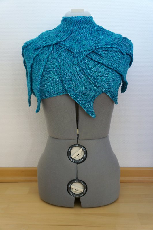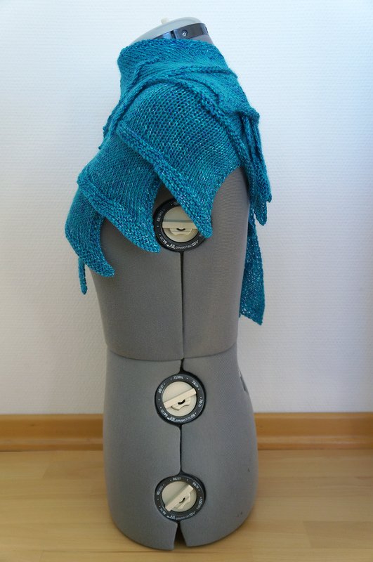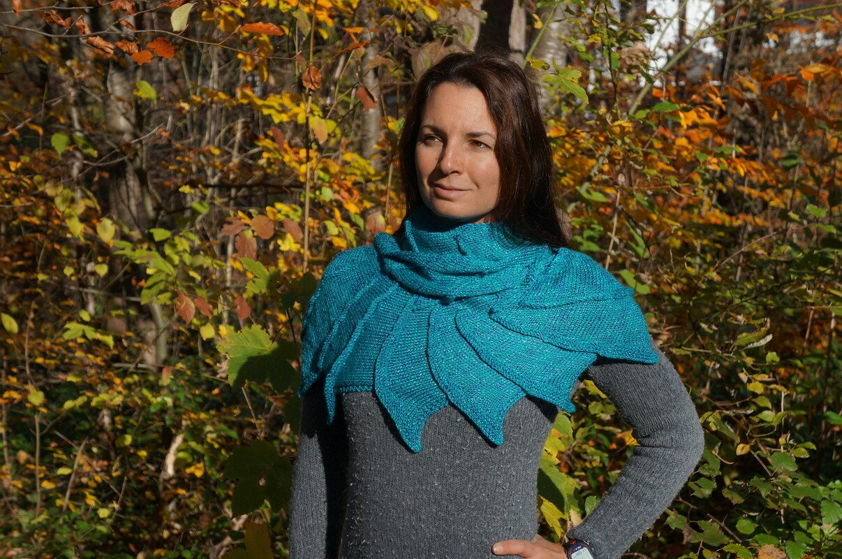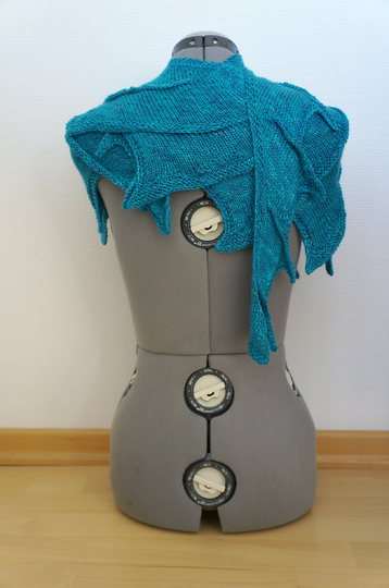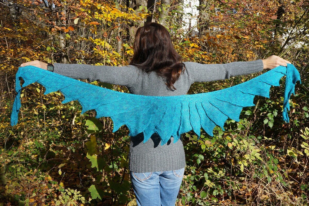 Dieser Zackenschal lässt mehrere Tragevarianten zu, die durch die herausstehenden Zacken zu einem einzigartigem Aussehen führen. Der Schal macht durch die Konstruktion (Drachenschwanz) eine Innenkurve (mehr als auf dem Bild zu sehen ist), wodurch er sich schön um den Hals wickeln lässt.