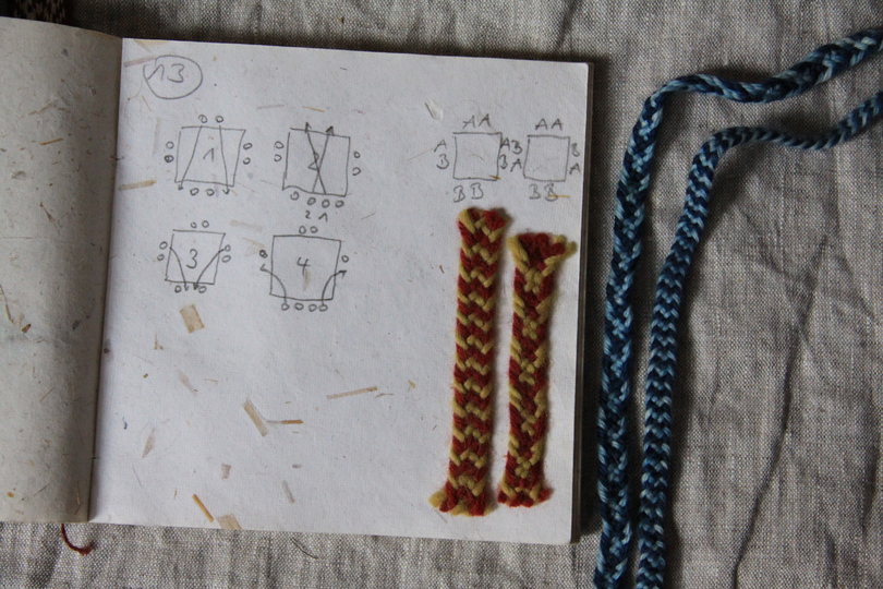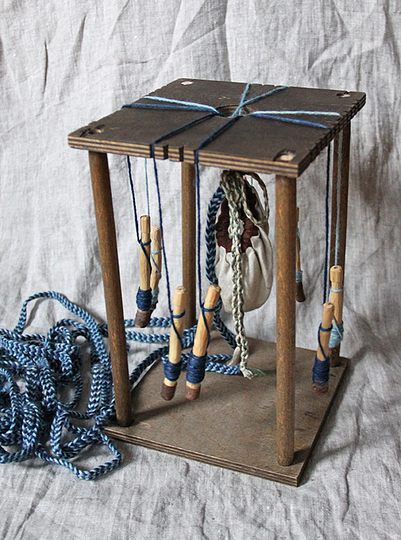 Dieses Band ist sehr einfach mit einem Marudai (japanischer Flecht-Tisch) nachzuarbeiten. Damit man sich vorstellen kann, was ein Marudai ist, habe ich ein Bild von meinem Flecht-Tischchen dazu gestellt.