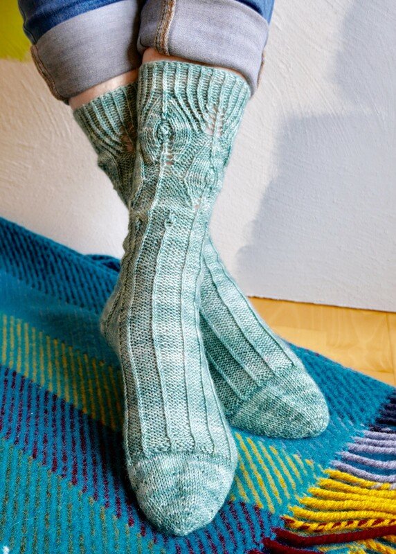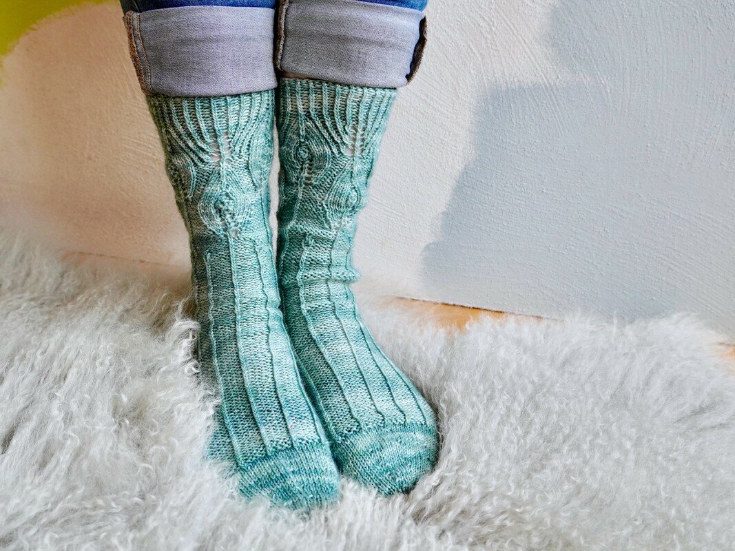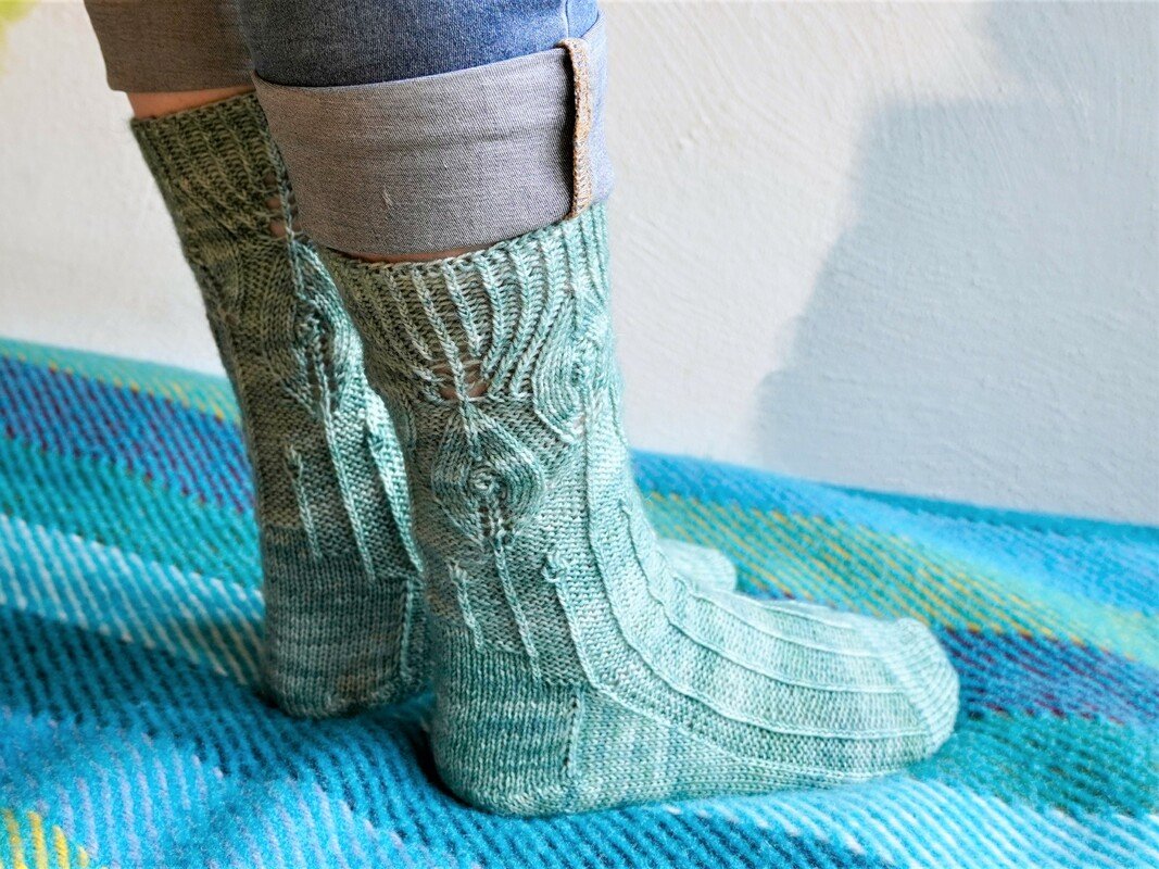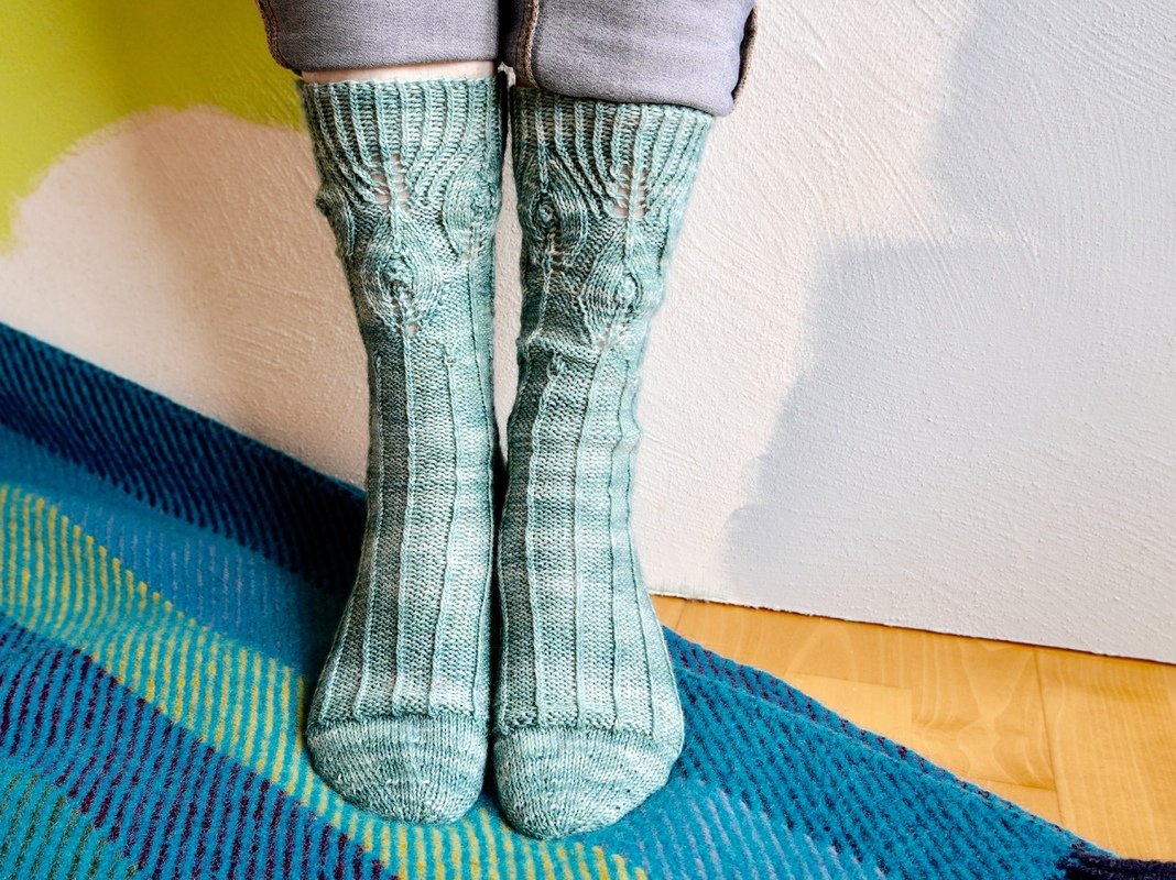 The TOE-UP socks "FEATHERS &LINES" are marvelously feminine and playful and really special. A combination of Ribbing and Lace Patterns provides variety in knitting. Starting point is at the toe with Stockinette Stitch, then a fine Rib Stitch Pattern runs along the foot to the ankle and finally merge into a beautiful Feather Pattern, which ends in an elegant Rib Pattern, building the cuff. And don't worry about the heel, it's explained in detail so you'll master it just fine!