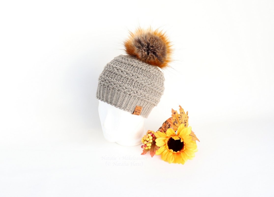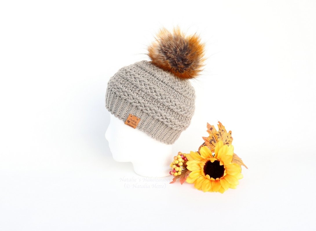 It is explained: material, explanation for all sizes, cuff, middle part, upper part, cable pattern, pom-pom, 10 pages, about 30 photos, description, crochet diagram, 4 x videos with explanation of the basic pattern, crochet with sl st, crochet with the "camel stitch", joining the beanie.