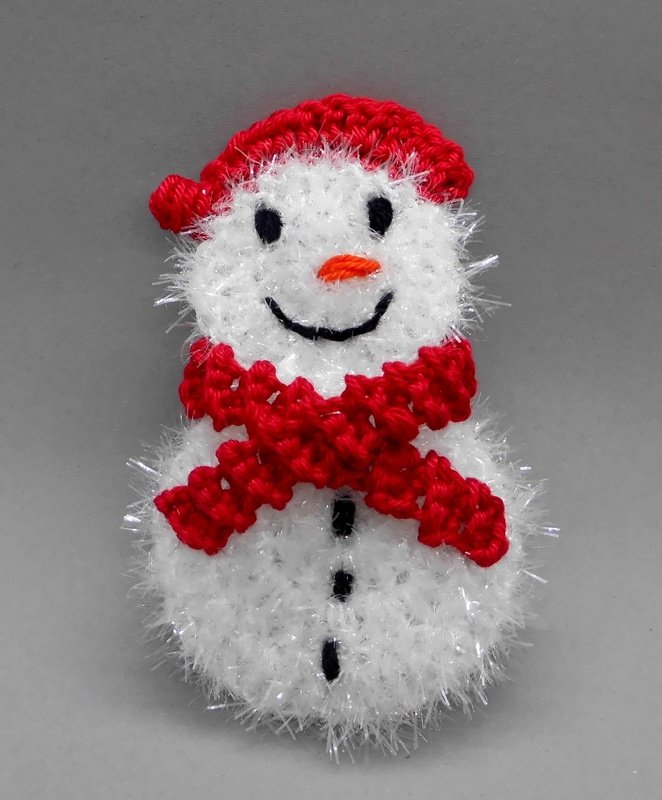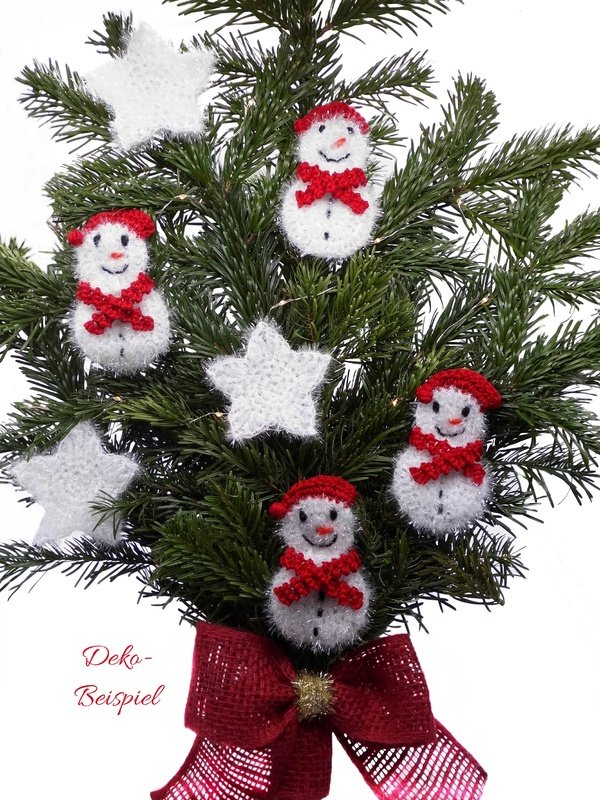 Die Schneemänner werden, aus Schwammgarn mit Häkelnadel 4 gehäkelt, ca. 11 x 6,5 cm groß.
