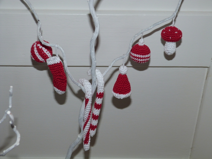 Bei Verwendung von Baumwollgarn mit einer Lauflänge von 125m/50g und Nadelstärke 2,5 bekommt die Kugel einen Durchmesser von ca. 4 cm, die Zuckerstangen werden ca. 14 cm lang.