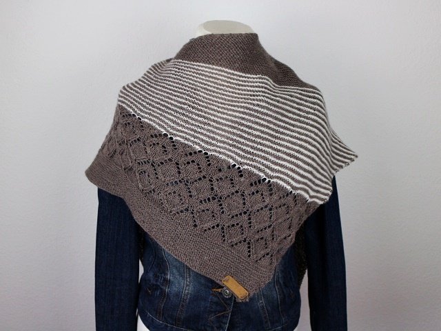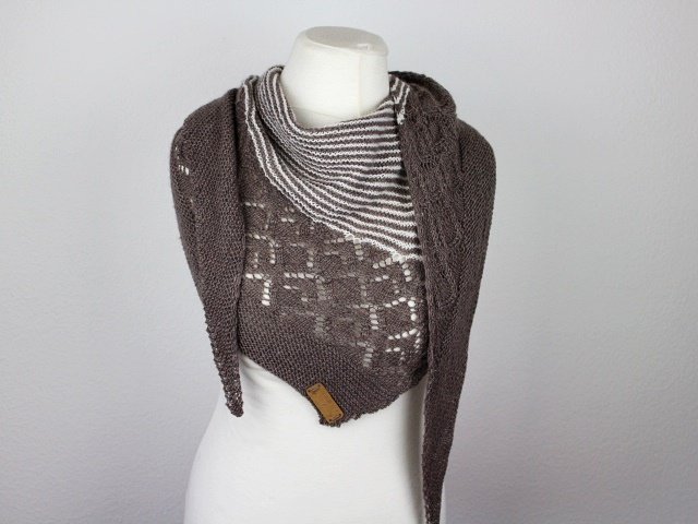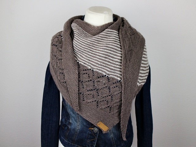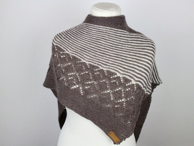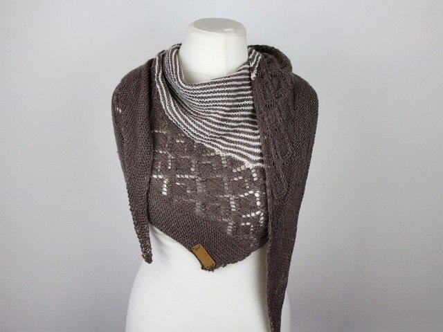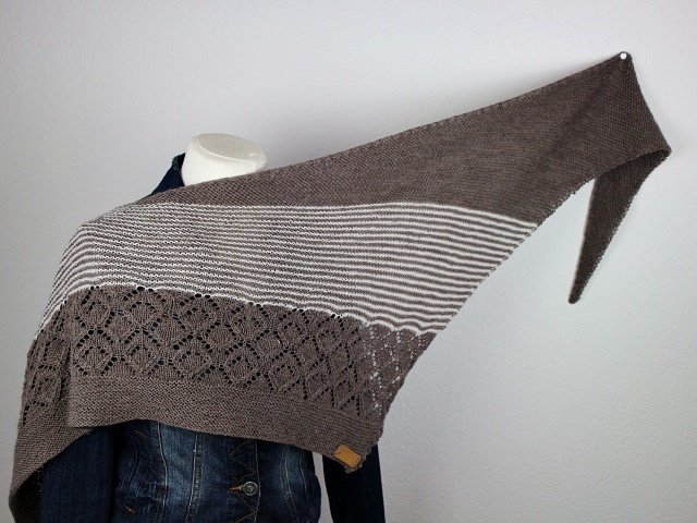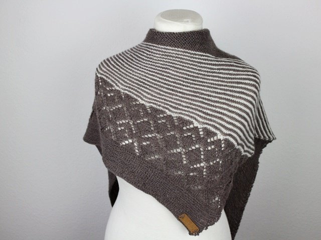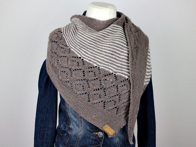 "Neina" is a asymetric shawl wich begins with only a few stitches and grows with increases at the sides. Garter stitch parts, stripes and a beautiful lacepattern.