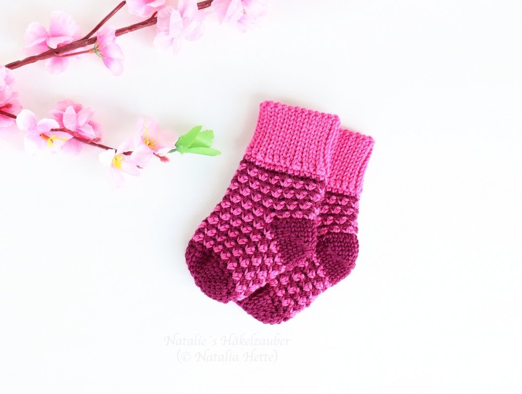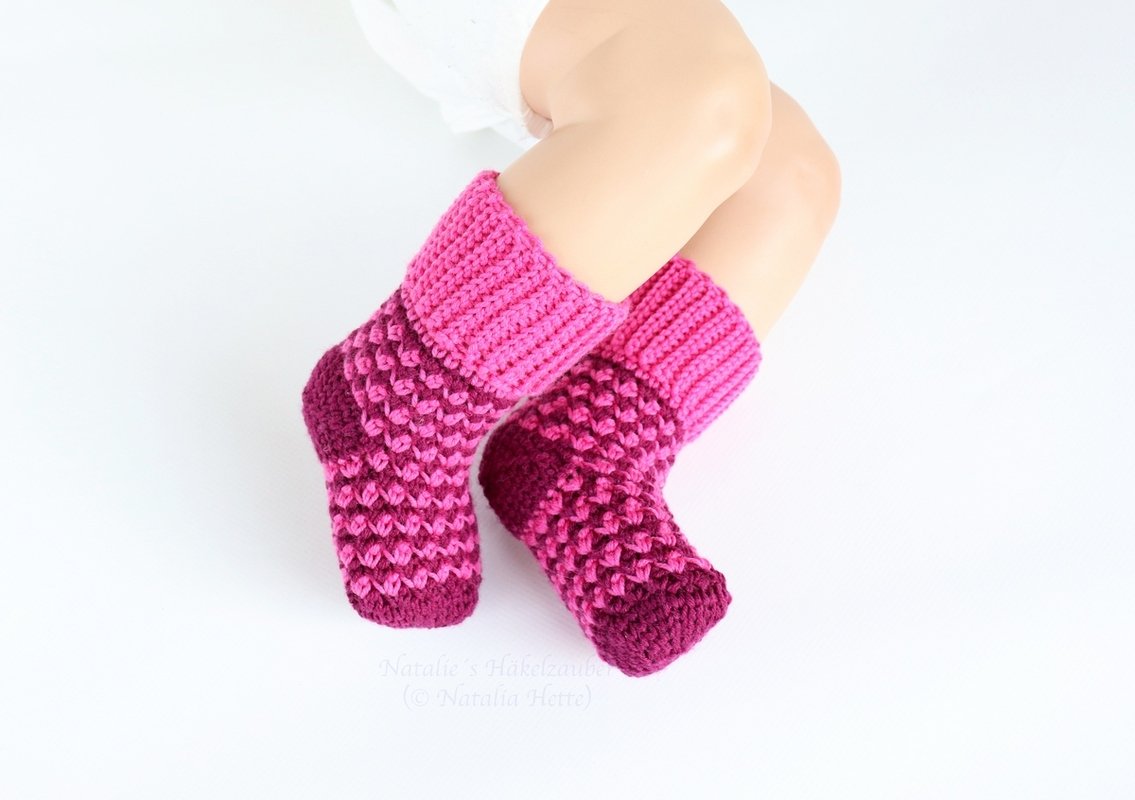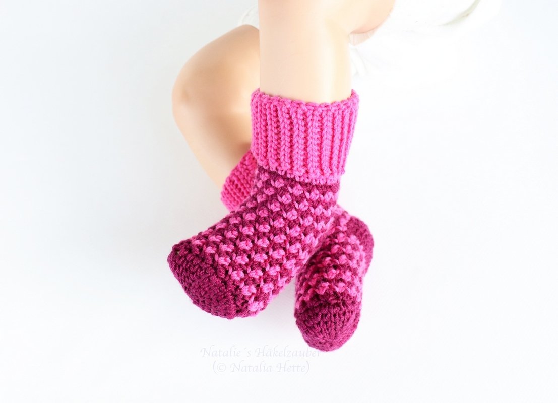 Crocheting soft baby & child socks with a two-colour pattern for your child or grandchild is no problem at all with this pattern! Two-coloured pattern, easily adjustable size make these socks a real eye-catcher! Of course, you can also crochet the socks in one colour or in gradient wool.