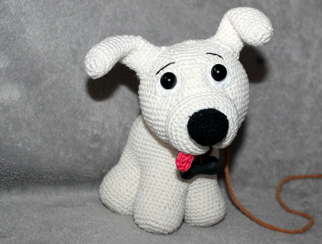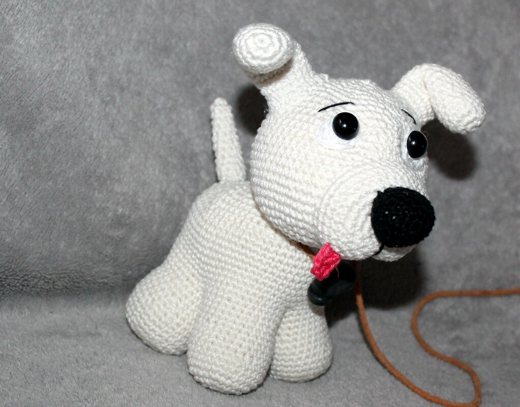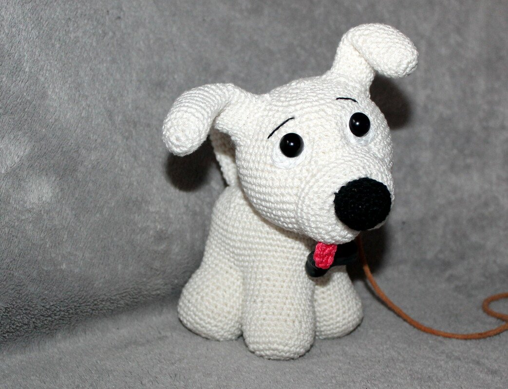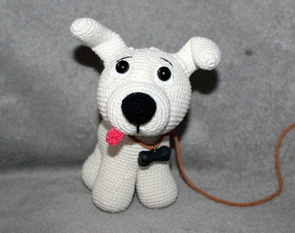 The crochet dog will become about 20 cm/ 8 inches tall and 15 cm/ 6 inches long.