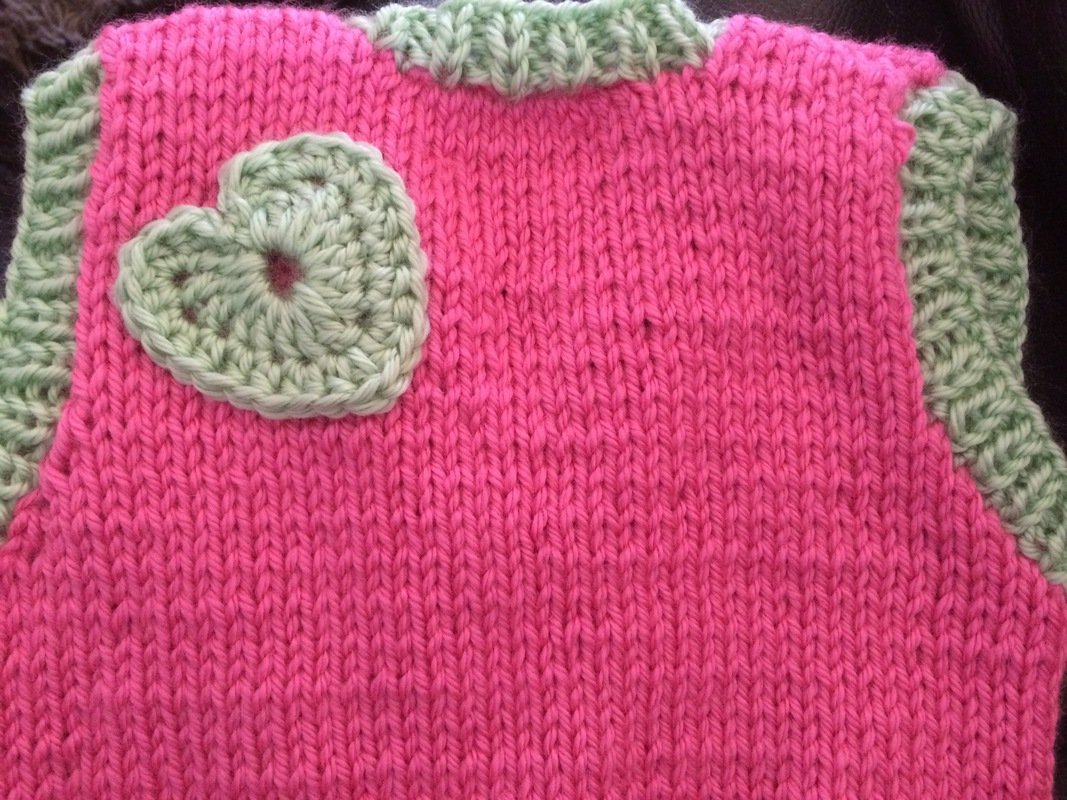 Dieser süsse Pullunder mit V-Auschnitt ist sehr einfach zu stricken.Grundkenntnisse sollten vorhanden sein.Der Pullunder wird gestrickt und das Herz gehäkelt.
