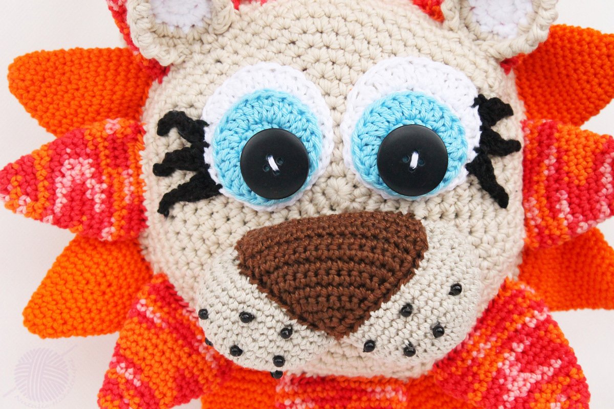 Löwe: Grundanleitung runde Tasche, Reißverschluss, Taschengriffe, Löwe: Mähne, Maul, Nase, Augen, 18 Seiten, ca. 40 Fotos.