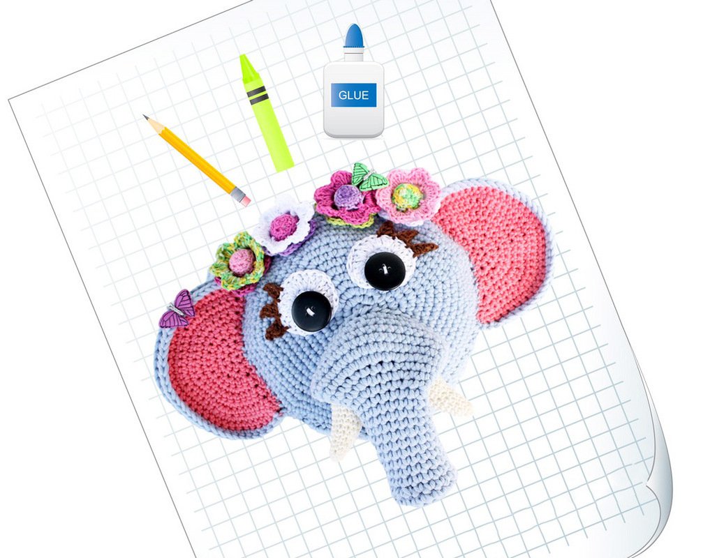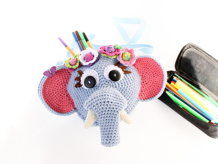 Elefant: Grundanleitung runde Tasche, Reißverschluss, Taschengriffe, Elefant: Ohren, Rüssel, Stoßzähne, Augen, Blumen, 17 Seiten, ca. 40 Fotos.