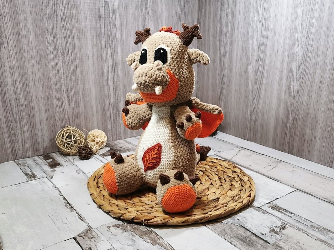 The finished dragon will be about 35cm high. Of course, the size can vary depending on whether you crochet tight or loose. The choice of wool is also important. I crochet with cotton yarn 125m/50g (100% cotton) and Himalaya Dolphin Baby 120m/100g.