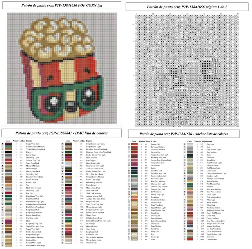 A pdf pattern with color and black and white grid of the image, list of colors DMC and Anchor symbols