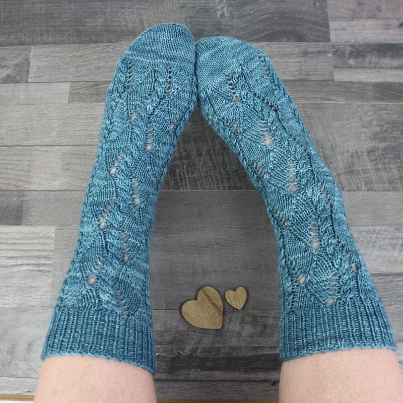 The Morning Dew Socks feature an elegant stitch pattern that combines delicate lace with subtle cable details. The result is a balanced and eye-catching design that remains comfortable and wearable for everyday use.